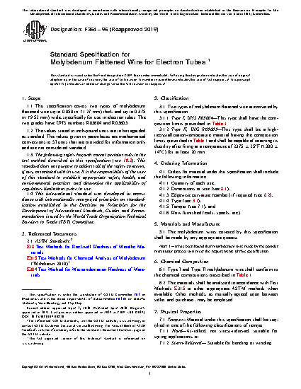 1.1 This specification covers two types of molybdenum flattened wire up to 0.050 in. (1.27 mm) thick and up to 0.375 in. (9.52 mm) wide, specifically for use in electron tubes. The two grades have UNS numbers R03604 and R03603.