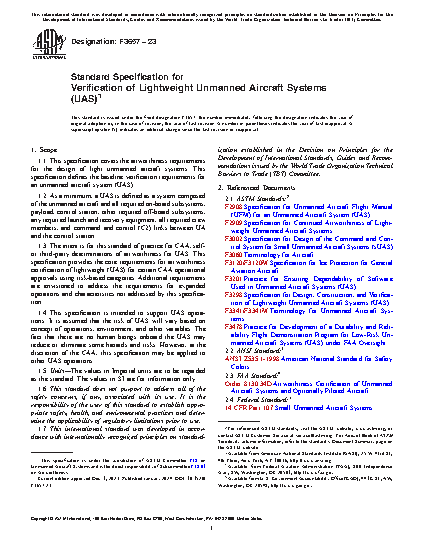1.1 This specification covers the airworthiness requirements for the design of light unmanned aircraft systems. This specification defines the baseline verification requirements for an unmanned aircraft system (UAS).
