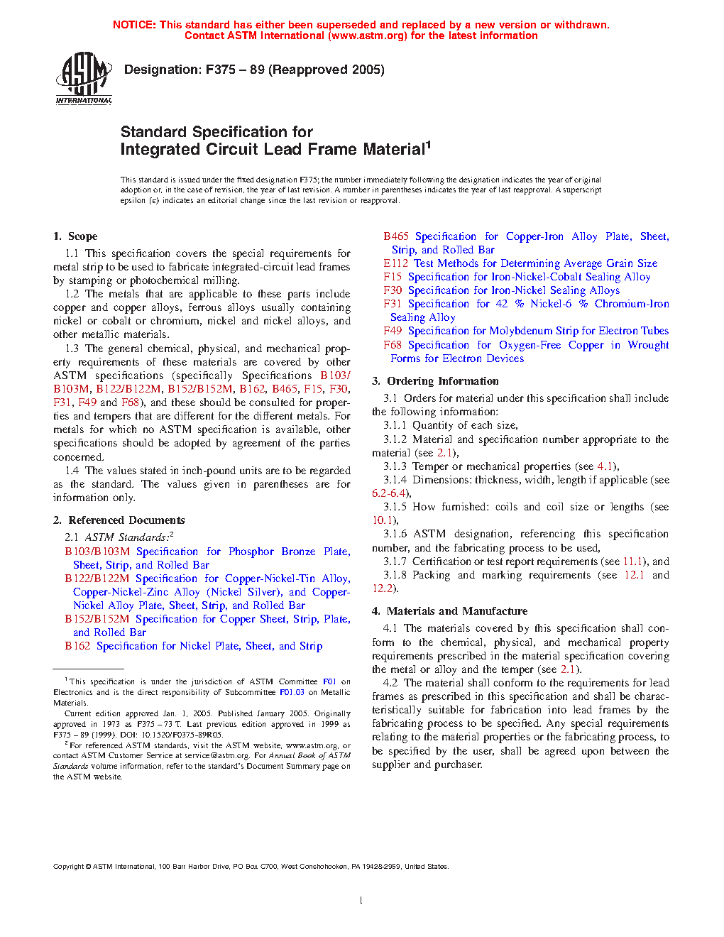 1.3 The general chemical, physical, and mechanical property requirements of these materials are covered by other ASTM specifications (specifically Specifications B103/ B103M, B122/B122M, B152, B162, B465, F15, F30, F31, F49 and F68), and these should be consulted for properties and tempers that are different for the different metals. For metals for which no ASTM specification is available, other specifications should be adopted by agreement of the parties concerned.