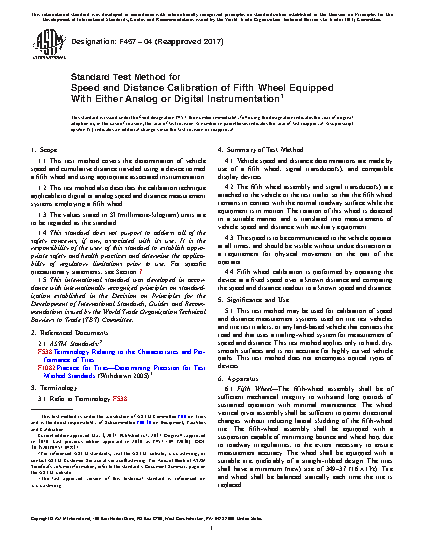 1.1 This test method covers the determination of vehicle speed and cumulative distance traveled using a device termed a fifth wheel and using appropriate associated instrumentation.