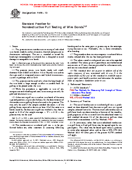 1.1 This practice covers nondestructive testing of individual wire bonds made by either ultrasonic, thermal compression or thermosonic techniques. The test is intended to reveal (by breaking) nonacceptable wire bonds but is designed to avoid damage to acceptable wire bonds.