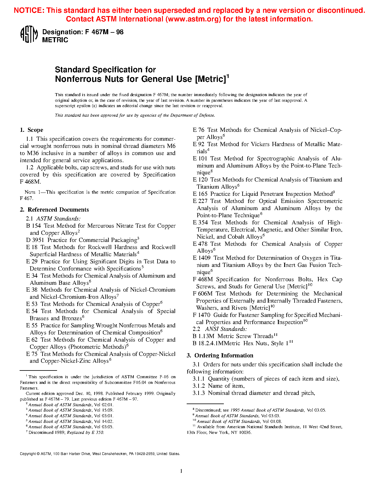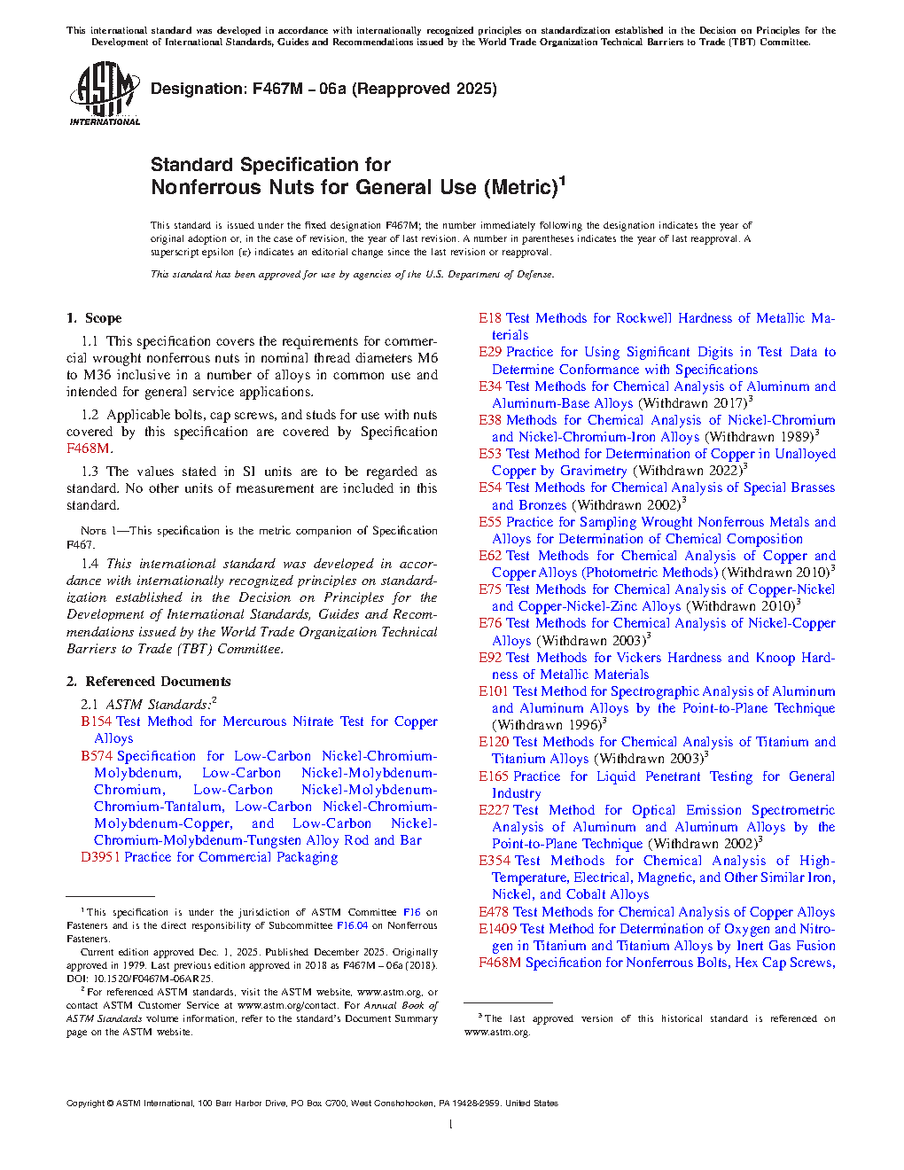 1.1 This specification covers the requirements for commercial wrought nonferrous nuts in nominal thread diameters M6 to M36 inclusive in a number of alloys in common use and intended for general service applications.