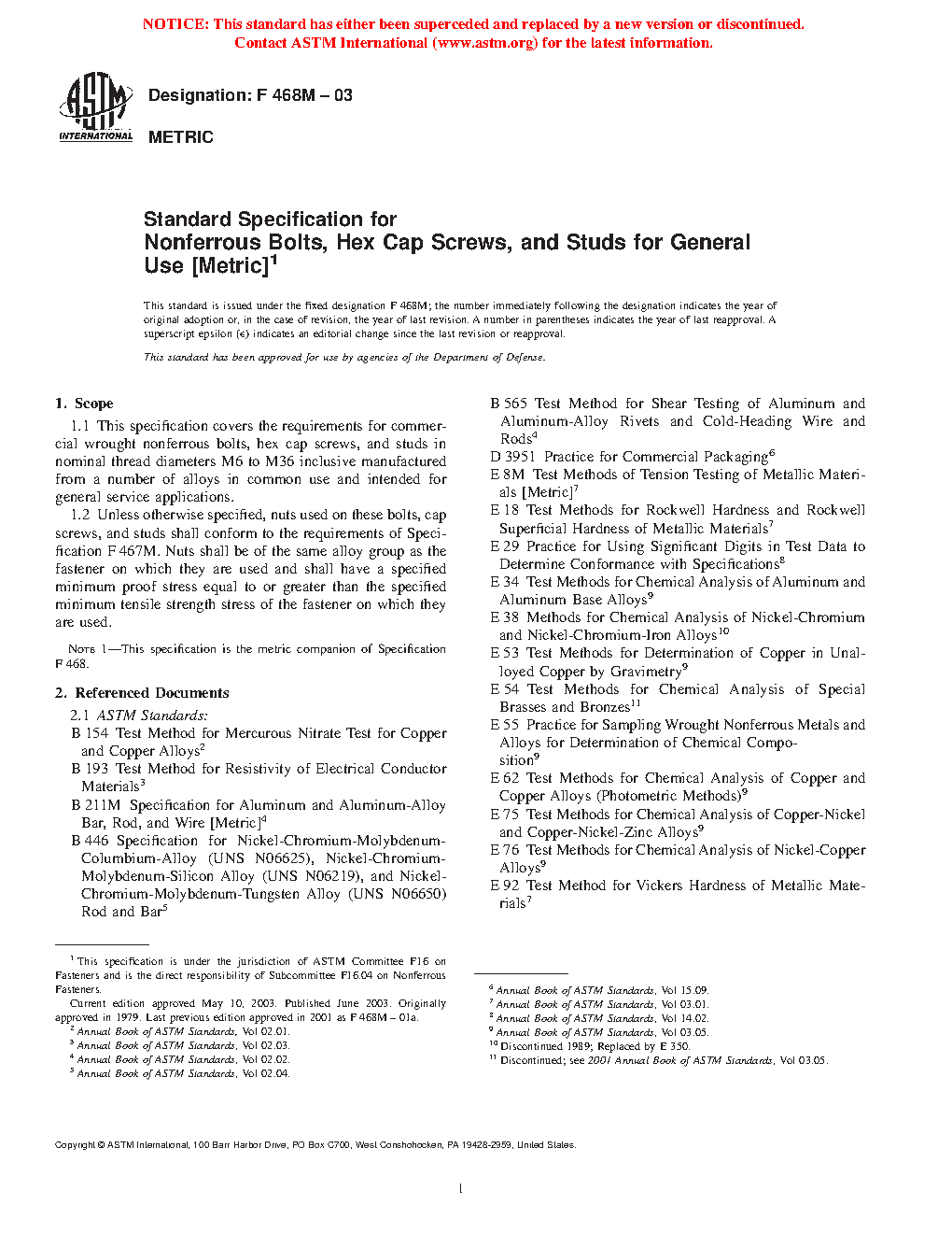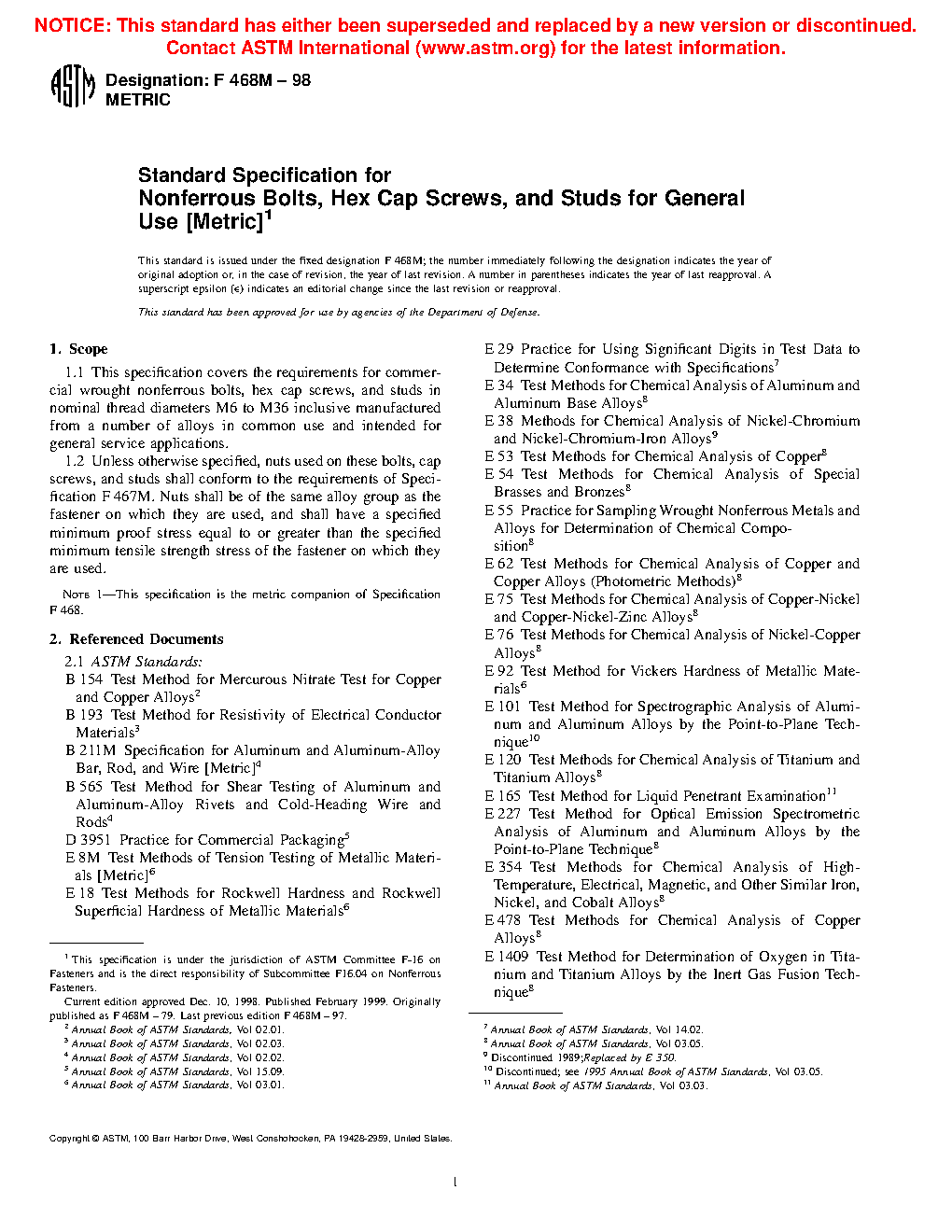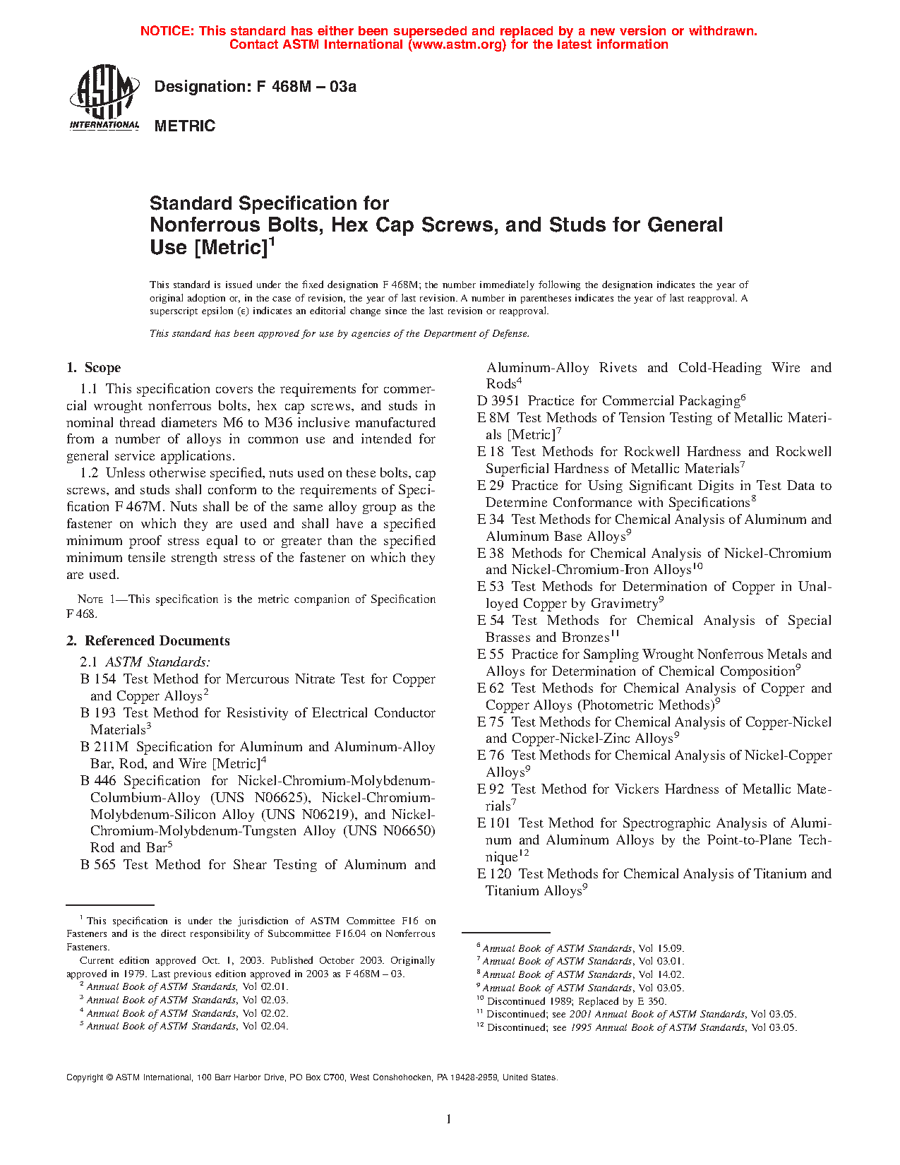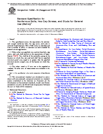 1.1 This specification covers the requirements for commercial wrought nonferrous bolts, hex cap screws, and studs in nominal thread diameters M6 to M36 inclusive manufactured from a number of alloys in common use and intended for general service applications.