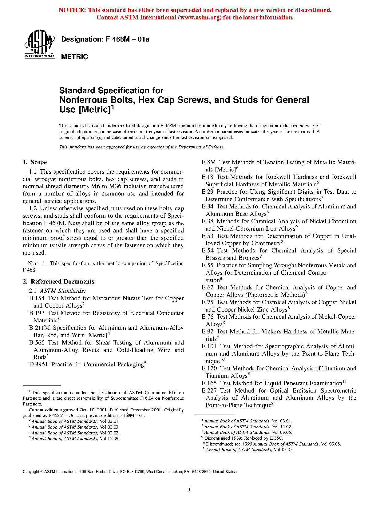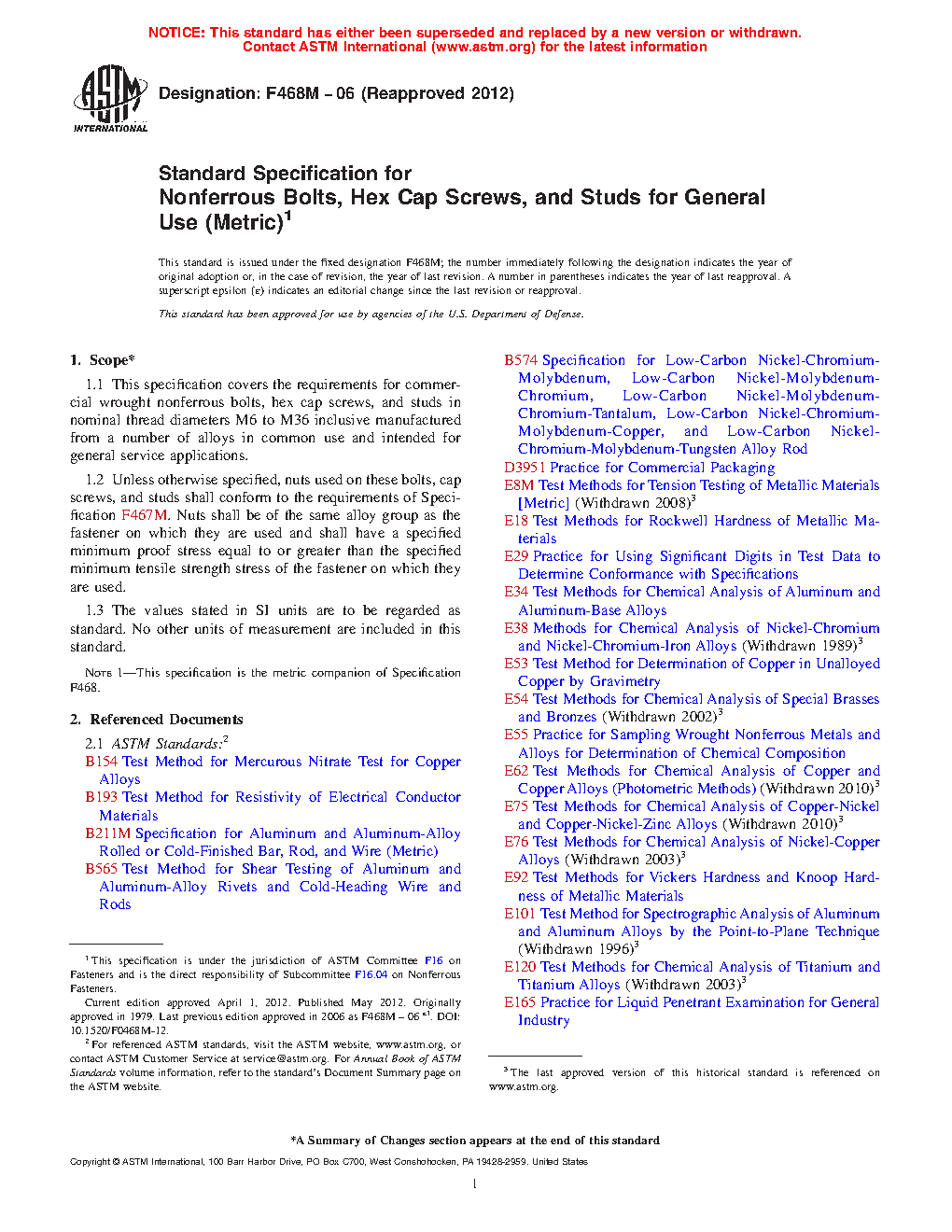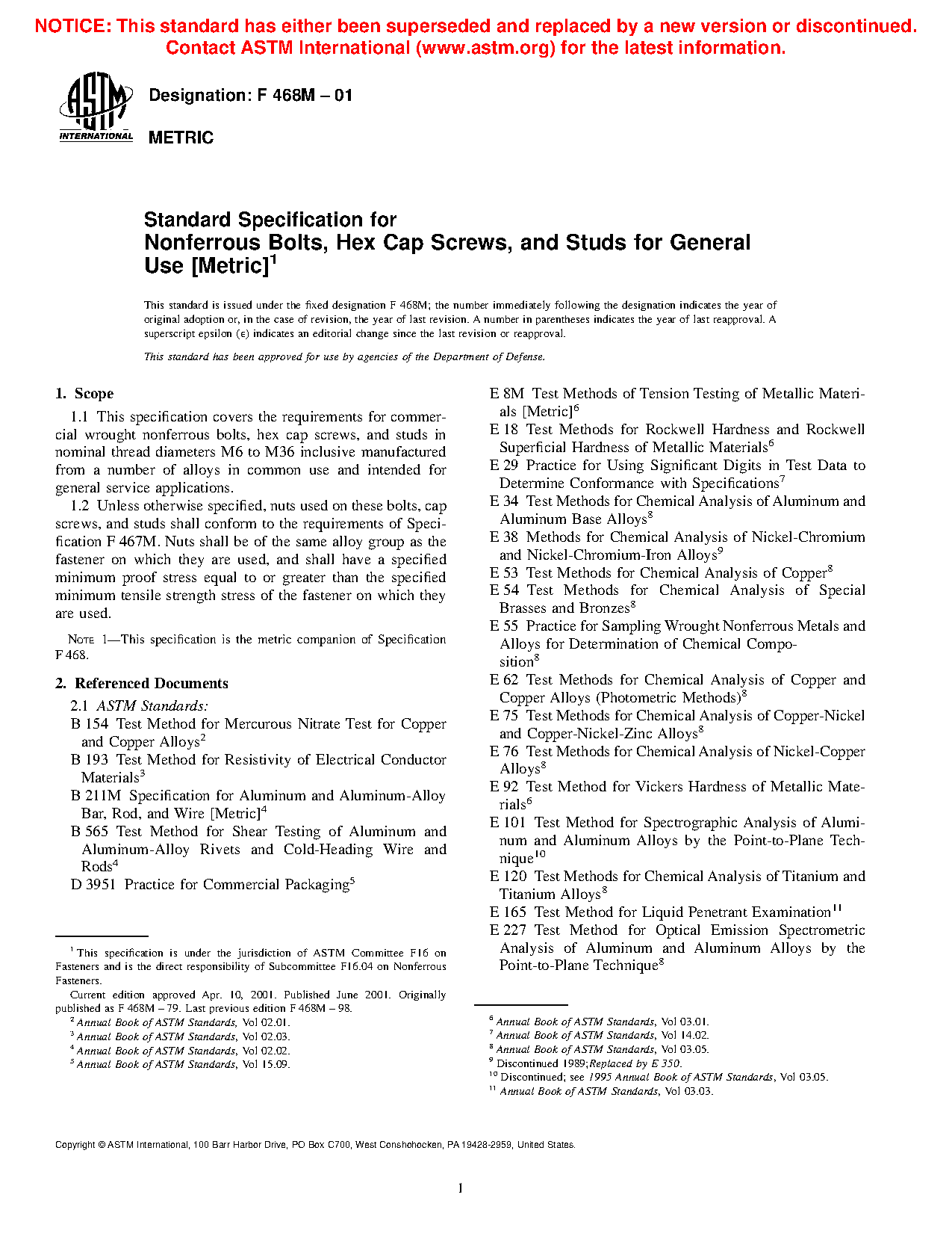 1.1 This specification covers the requirements for commercial wrought nonferrous bolts, hex cap screws, and studs in nominal thread diameters M6 to M36 inclusive manufactured from a number of alloys in common use and intended for general service applications.