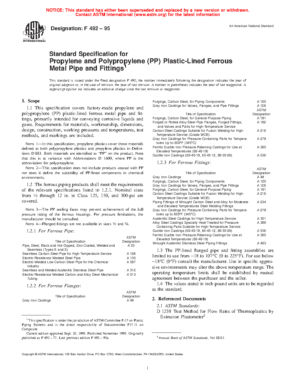 Standard Specification for Propylene and Polypropylene (PP) Plastic-Lined Ferrous Metal Pipe and Fittings (Withdrawn 2004)