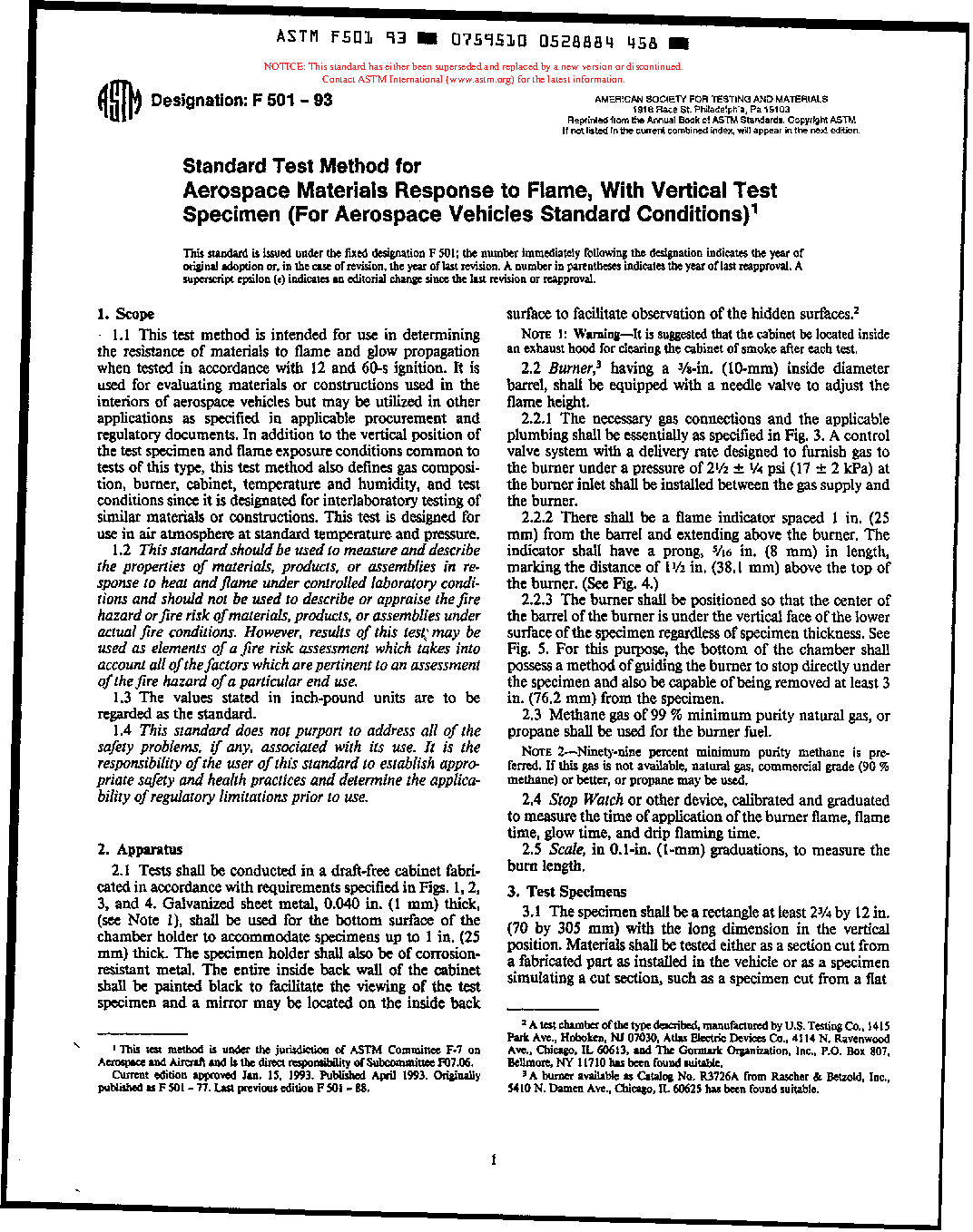 Test Method for Aerospace Materials Response to Flame, with Vertical Test Specimen (For Aerospace Vehicles Standard Conditions) (Withdrawn 1998)