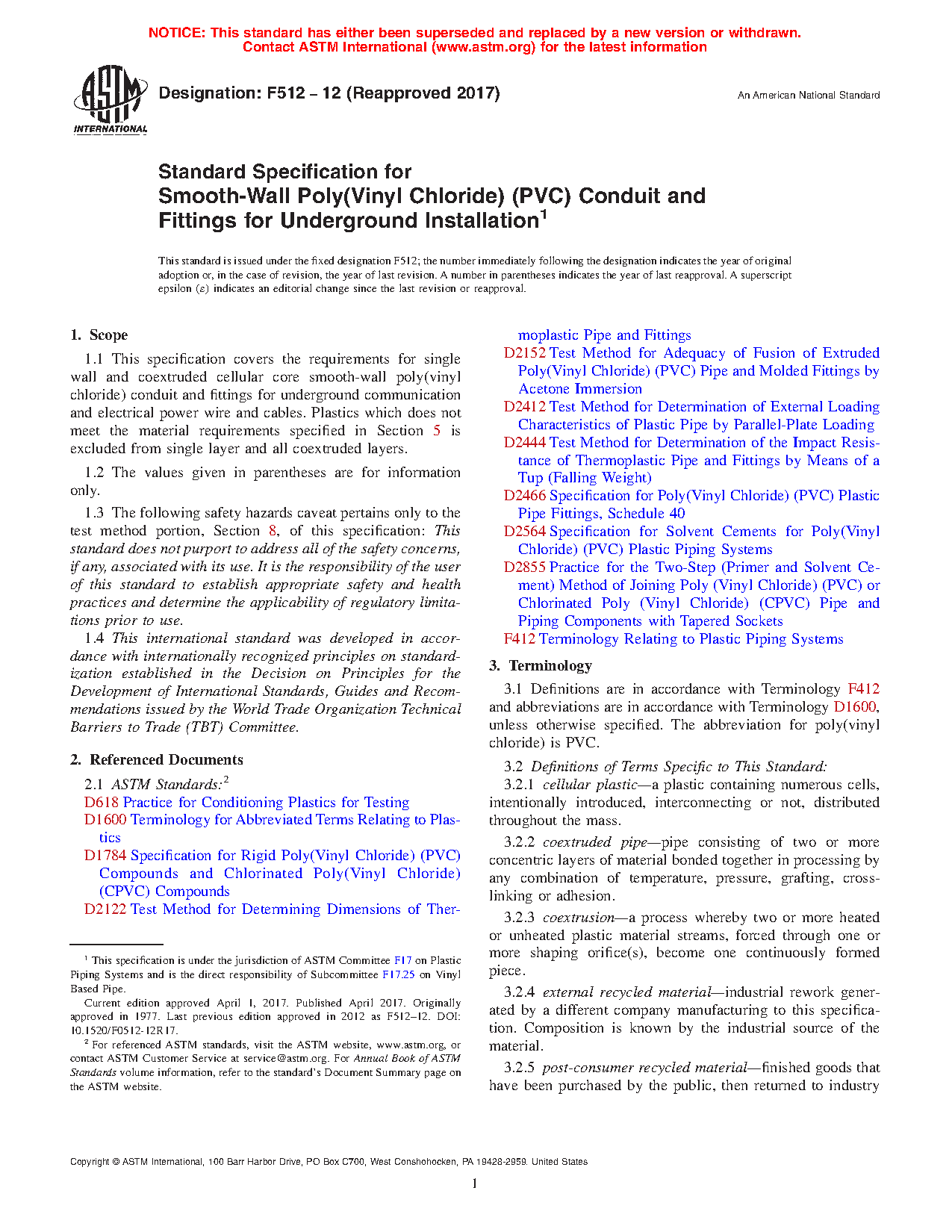 1.1 This specification covers the requirements for single wall and coextruded cellular core smooth-wall poly(vinyl chloride) conduit and fittings for underground communication and electrical power wire and cables. Plastics which does not meet the material requirements specified in Section 5 is excluded from single layer and all coextruded layers.