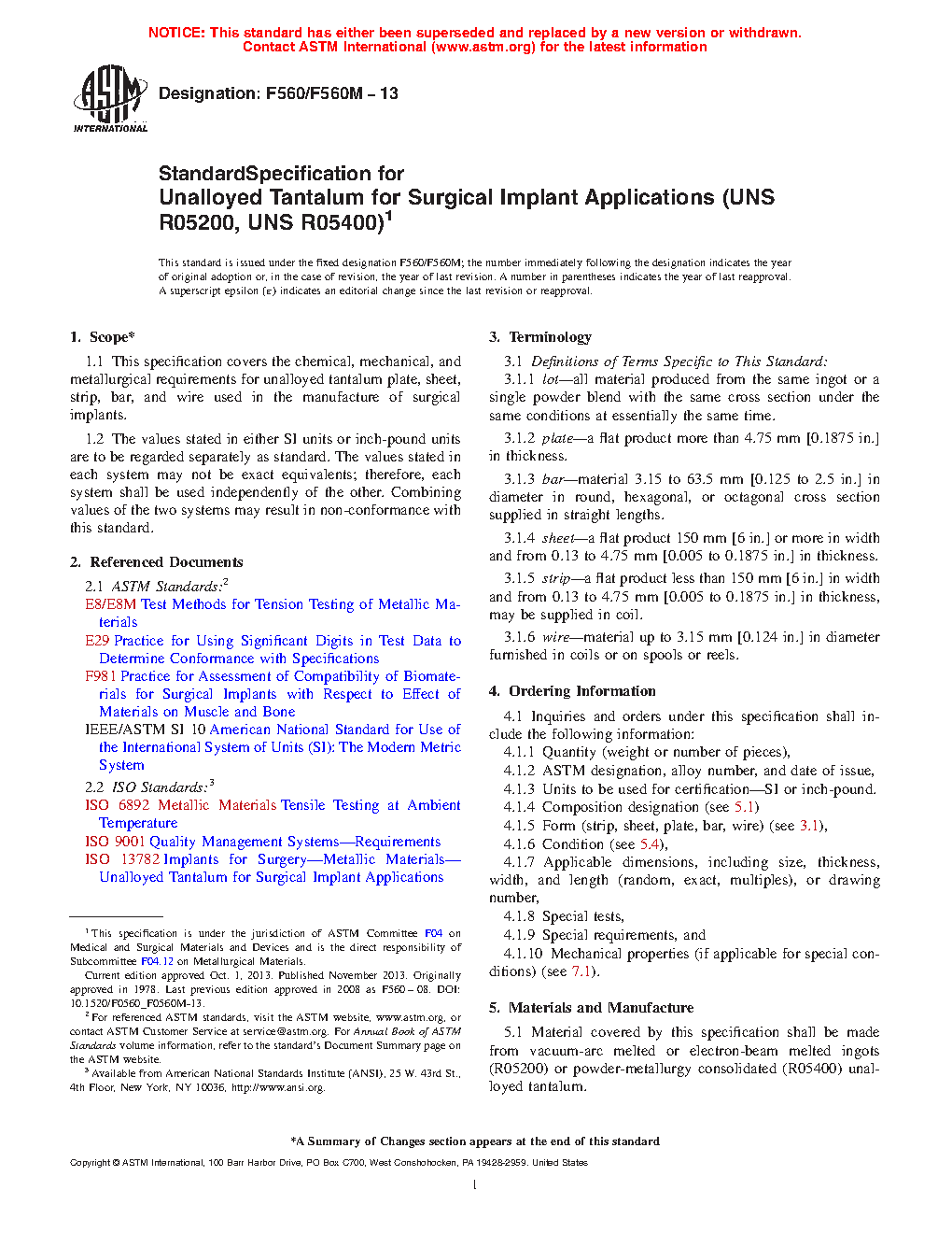 1.1 This specification covers the chemical, mechanical, and metallurgical requirements for unalloyed tantalum plate, sheet, strip, bar, and wire used in the manufacture of surgical implants.