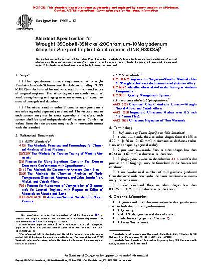 1.1 This specification covers requirements of wrought 35cobalt-35nickel-20chromium-10molybdenum alloy (UNS R30035) in the form of bar and wire, used for the manufacture of surgical implants. This alloy depends on combinations of work strengthening and aging to attain a variety of combinations of strength and ductility.
