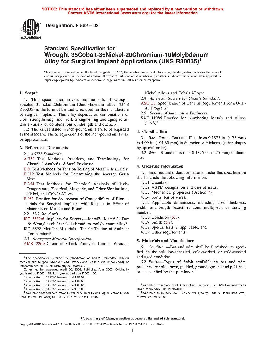 Standard Specification for Wrought 35Cobalt-35Nickel-20Chromium-10Molybdenum Alloy for Surgical Implant Applications (UNS R30035)