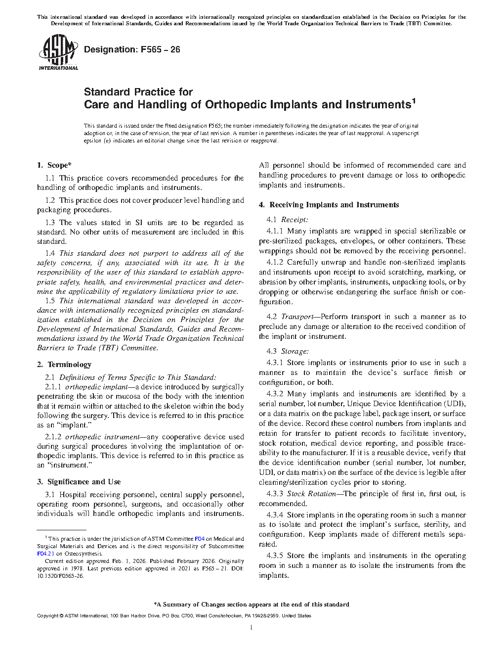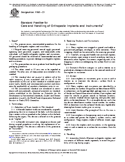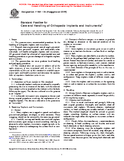 This practice covers recommended procedures for the handling of orthopedic implants and instruments. Hospital receiving personnel, central supply personnel, operating room personnel, surgeons, and occasionally other individuals will handle orthopedic implants and instruments. All personnel should be informed of recommended care and handling procedures to prevent damage of orthopedic implants and instruments. Many implants are wrapped in special sterilizable or pre-sterilized packages, envelopes, or other containers. These wrappings should not be removed by the receiving personnel. Perform transport in a manner to preclude any damage or alteration to the received condition of the implant or instrument. Store implants or instruments prior to use in such a manner as to maintain the device’s surface finish or configuration, or both. Maintain orthopedic implants and instruments of different metals separately to avoid the possibility of mixing during surgery. Prior to initial sterilization and promptly following each surgical procedure, thoroughly and carefully clean all instruments and implants. Dispose of orthopedic implants that exhibit surface or configuration damage. Avoid the reimplantation of previously implanted orthopedic implants.