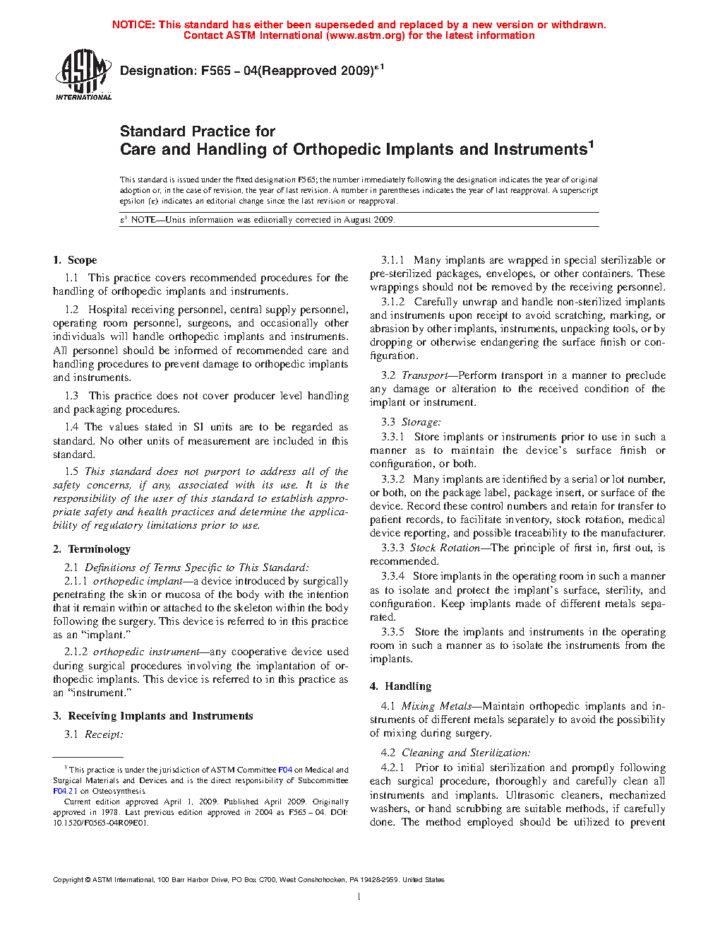 1.1 This practice covers recommended procedures for the handling of orthopedic implants and instruments.