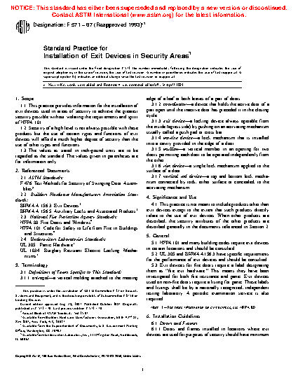 1.1 This practice provides information for the installation of exit devices used in areas of security to achieve the greatest security possible without violating the requirements and spirit of NFPA 101.