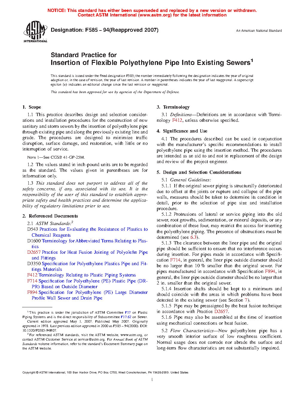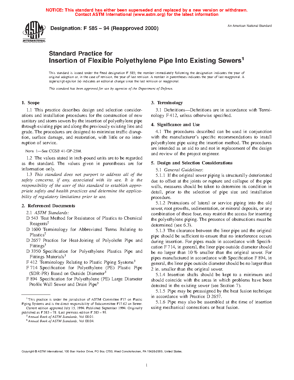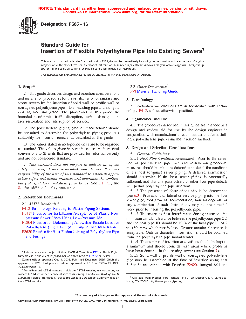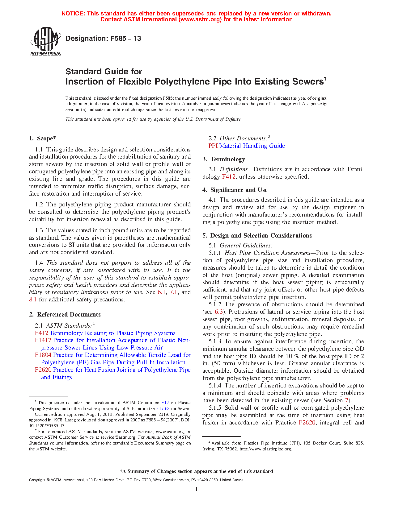 1.2 The polyethylene piping product manufacturer should be consulted to determine the polyethylene piping product’s suitability for insertion renewal as described in this guide.