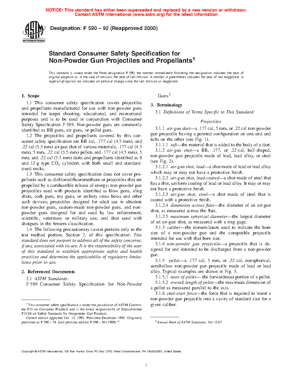 1.1 This consumer safety specification covers projectiles and propellants manufactured for use with non-powder guns intended for target shooting, educational, and recreational purposes and is to be used in conjunction with Consumer Safety Specification F589. Non-powder guns are commonly identified as BB guns, air guns, or pellet guns.