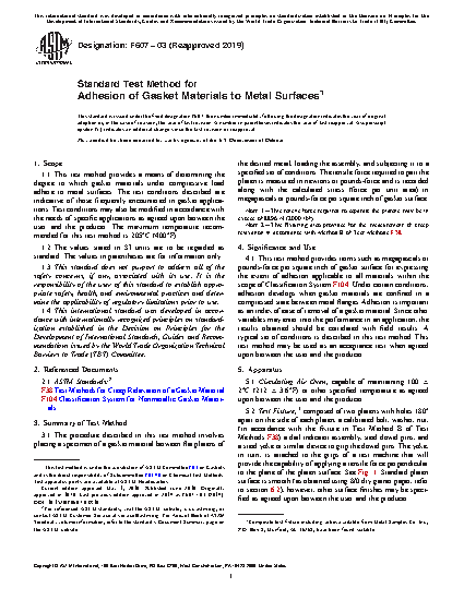 4.1 This test method provides terms such as megapascals or pounds-force per square inch of gasket surface for expressing the extent of adhesion applicable to all materials within the scope of Classification System F104. Under certain conditions, adhesion develops when gasket materials are confined in a compressed state between metal flanges. Adhesion is important as an index of ease of removal of a gasket material. Since other variables may enter into the performance in an application, the results obtained should be correlated with field results. A typical set of conditions is described in this test method. This test method may be used as an acceptance test when agreed upon between the user and the producer.