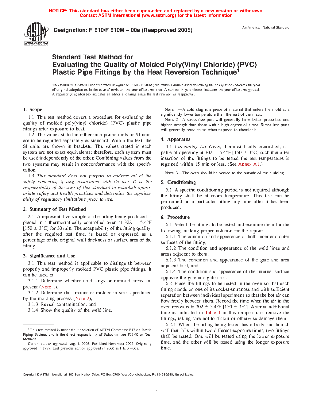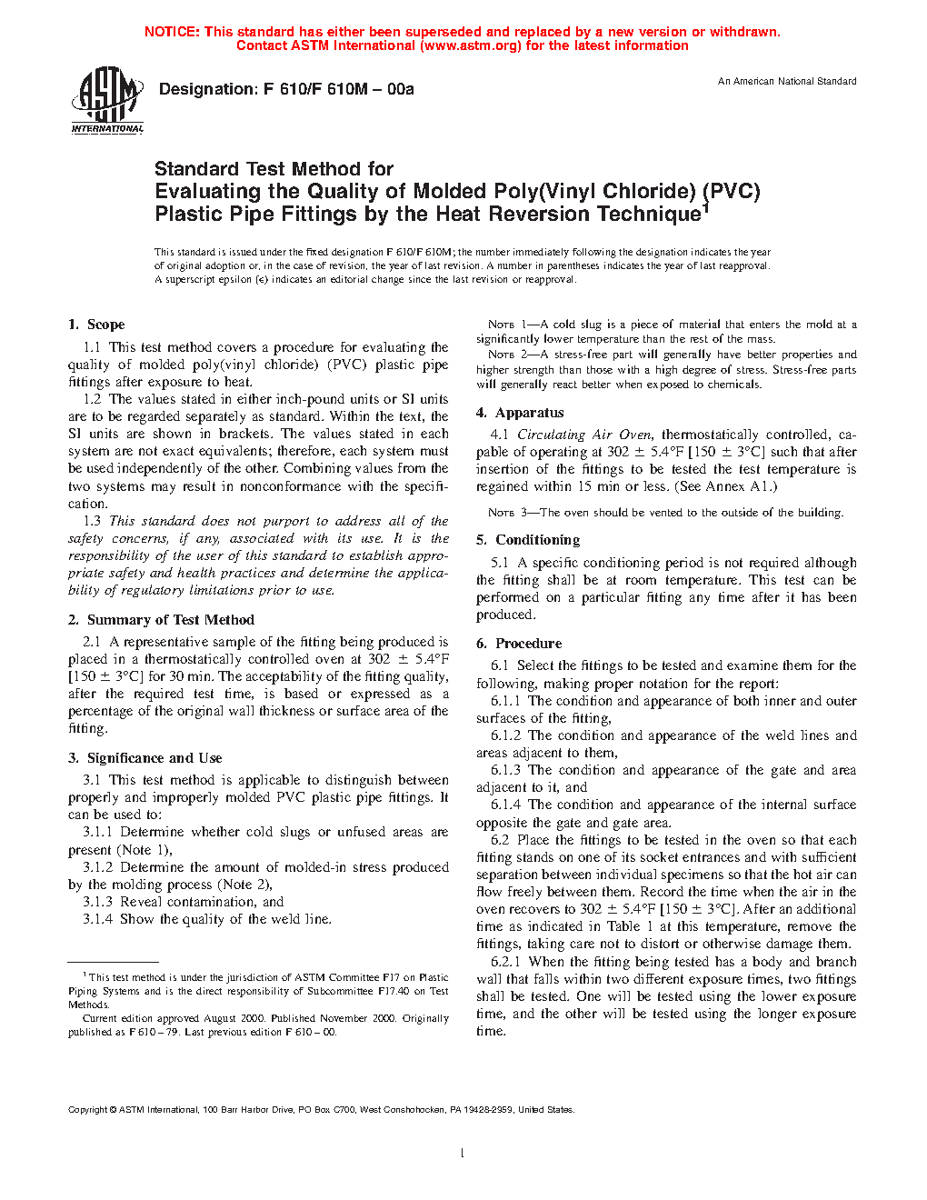 1.1 This practice covers a procedure for evaluating the quality of molded poly(vinyl chloride) (PVC) plastic pipe fittings after exposure to heat.