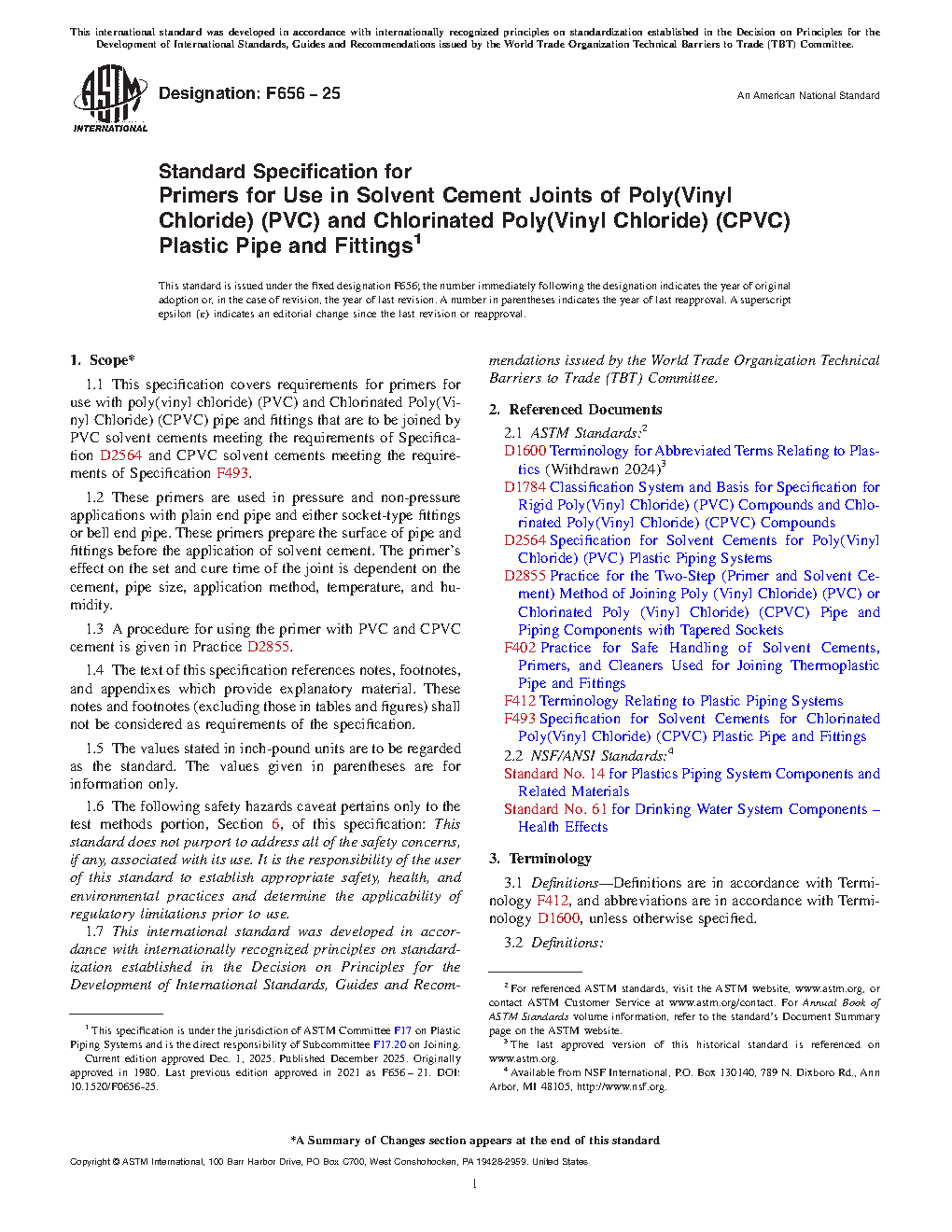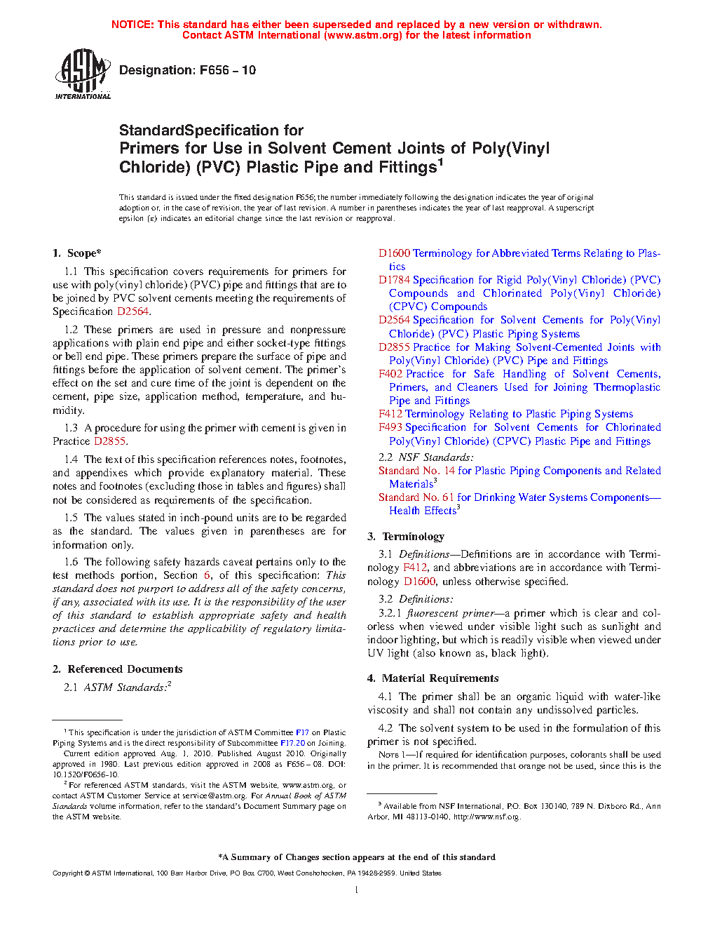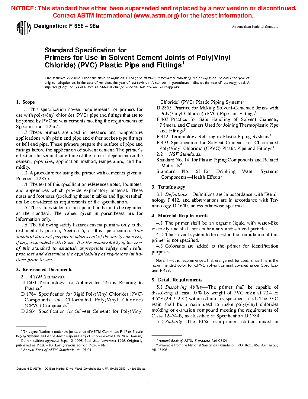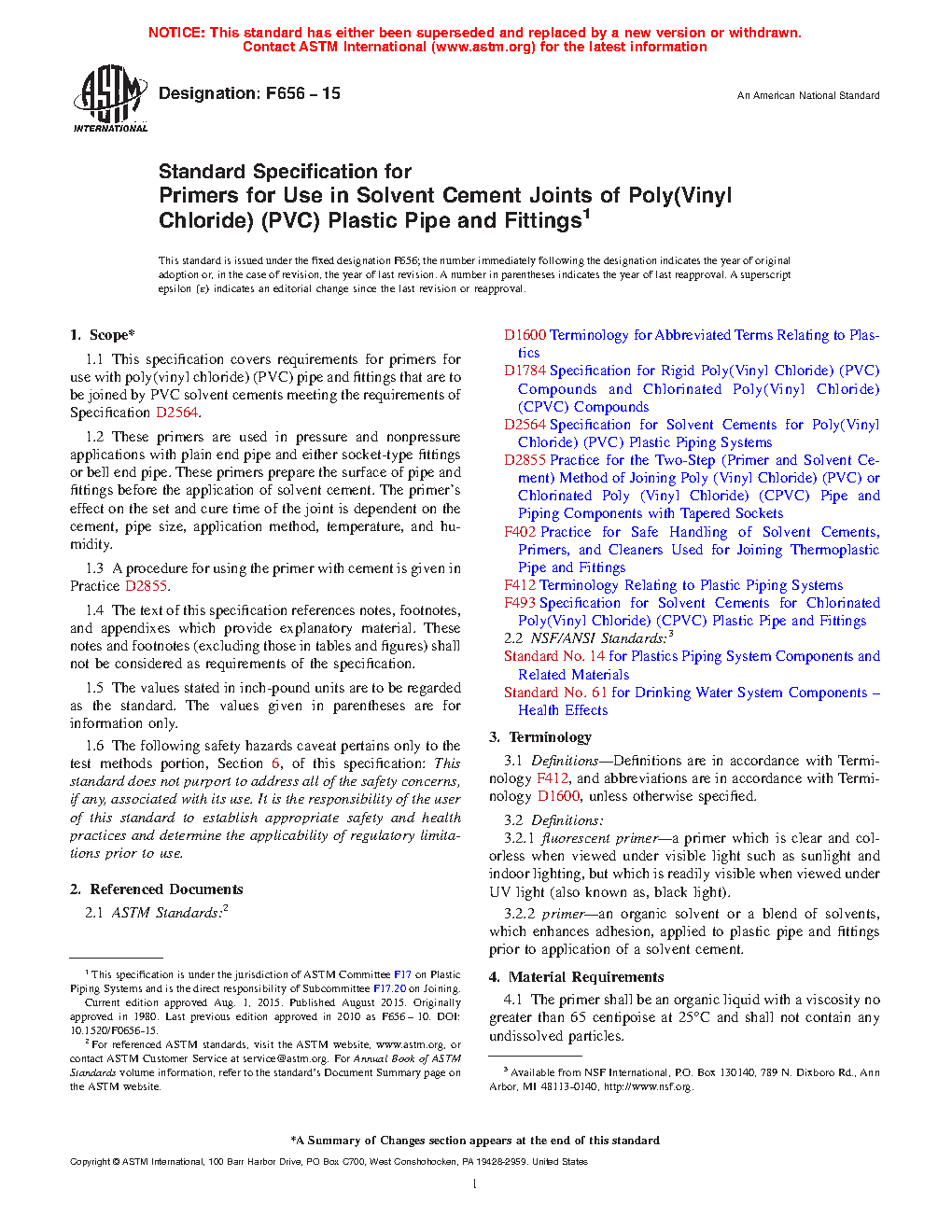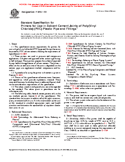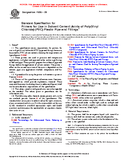 1.1 This specification covers requirements for primers for use with poly(vinyl chloride) (PVC) and Chlorinated Poly(Vinyl Chloride) (CPVC) pipe and fittings that are to be joined by PVC solvent cements meeting the requirements of Specification D2564 and CPVC solvent cements meeting the requirements of Specification F493.