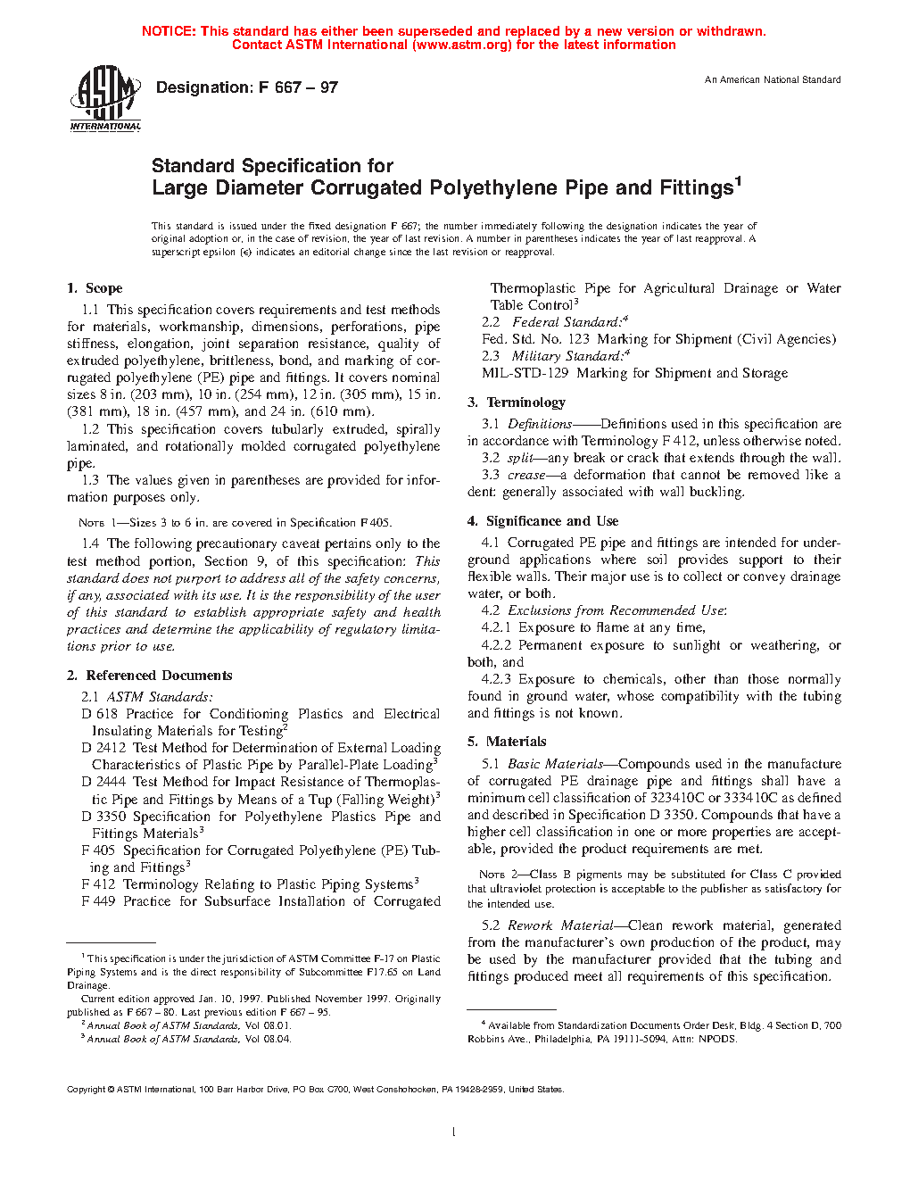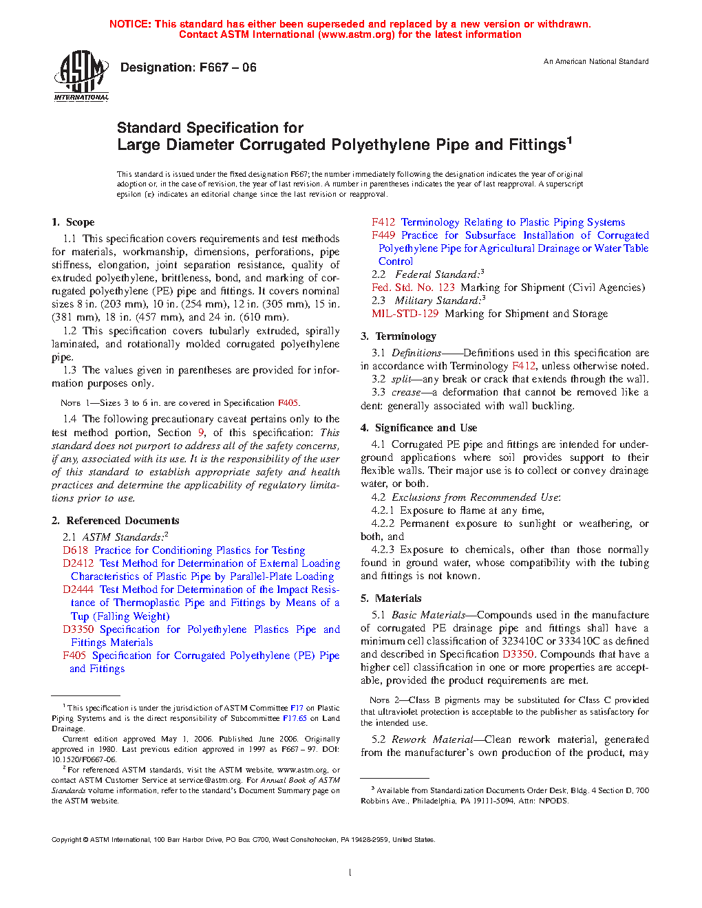 1.1 This specification covers requirements and test methods for materials, workmanship, dimensions, perforations, pipe stiffness, elongation, joint separation resistance, quality of extruded polyethylene, brittleness, bond, and marking of corrugated polyethylene (PE) pipe and fittings. It covers nominal sizes 3 in. (76 mm), 4 in. (102 mm), 5 in. (127 mm) 6 in. (152 mm), 8 in. (203 mm), 10 in. (254 mm), 12 in. (305 mm), 15 in. (381 mm), 18 in. (457 mm), and 24 in. (610 mm).
