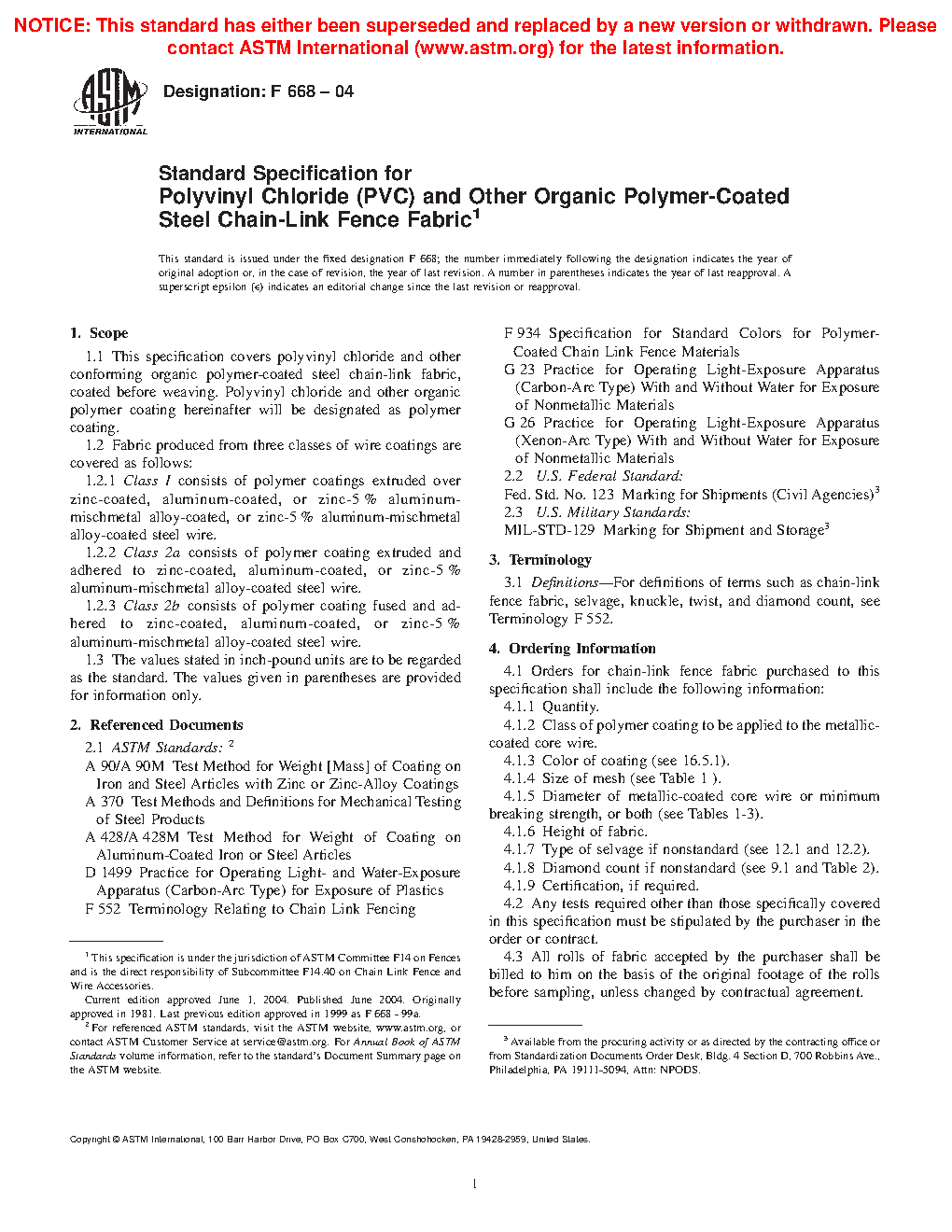 This specification covers polyvinyl chloride and other conforming organic polymer-coated steel chain-link fabric, coated before weaving. Fabric produced from three classes of wire coatings are covered as follows: Class I consists of polymer coatings extruded over zinc-coated, aluminum-coated, or zinc-5 % aluminum-mischmetal alloy-coated, or zinc-5 % aluminum-mischmetal alloy-coated steel wire; Class 2a consists of polymer coating extruded and adhered to zinc-coated, aluminum-coated, or zinc-5 % aluminum-mischmetal alloy-coated steel wire; Class 2b consists of polymer coating fused and adhered to zinc-coated, aluminum-coated, or zinc-5 % aluminum-mischmetal alloy-coated steel wire. Materials shall be tested and the individual grades shall conform to material, weave, mesh size, diamond count, wire size, fabric height, selvage, breaking strength, weight of Zinc, Aluminum, or Zinc-5 % Aluminum-Mischmetal Alloy Coatings, polymer coating thickness, polymer-coated wire, and roll length.
