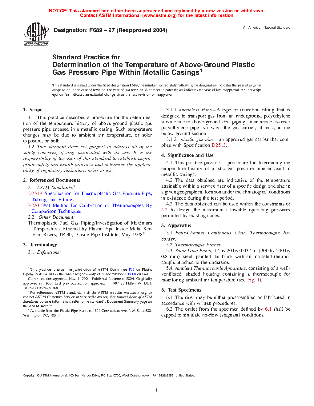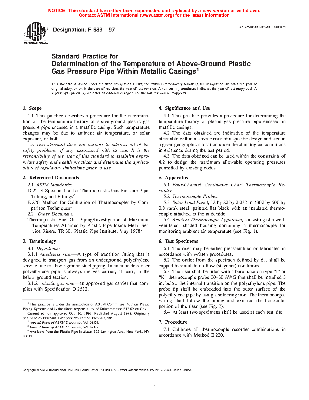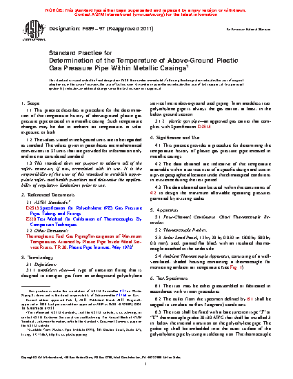 1.1 This practice describes a procedure for the determination of the temperature history of above-ground plastic gas pressure pipe encased in a metallic casing. Such temperature changes may be due to ambient air temperature, or solar exposure, or both.