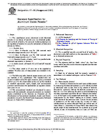 1.1 This specification covers aluminum oxide (alumina) powder in two classes of particle size, two chemical grades, and two levels of acidity, for use as an insulating coating or as an ingredient of ceramic mixtures for components of electronic devices as follows: