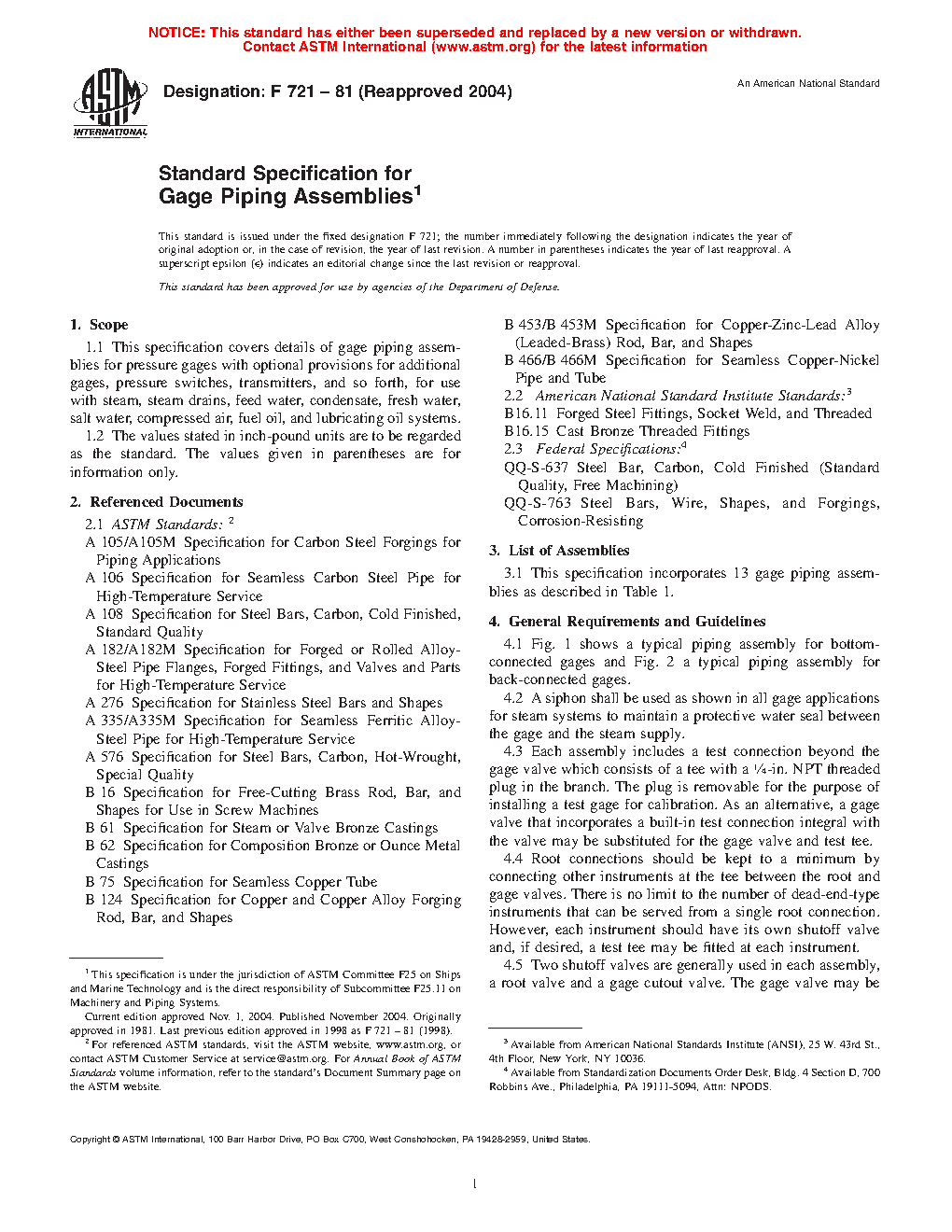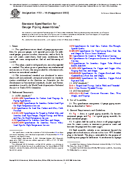 1.1 This specification covers details of gage piping assemblies for pressure gages with optional provisions for additional gages, pressure switches, transmitters, and so forth, for use with steam, steam drains, feed water, condensate, fresh water, salt water, compressed air, fuel oil, and lubricating oil systems.
