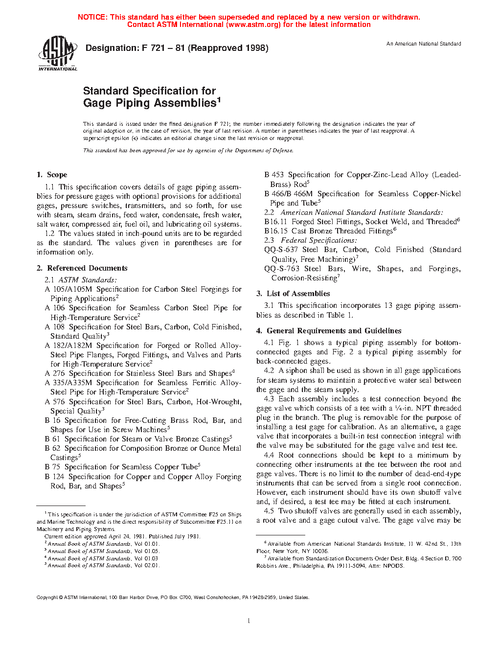 This specification covers details of gage piping assemblies for pressure gages with optional provisions for additional gages, pressure switches, transmitters, and so forth, for use with steam, steam drains, feed water, condensate, fresh water, salt water, compressed air, fuel oil, and lubricating oil systems. A siphon shall be used as shown in all gage applications for steam systems to maintain a protective water seal between the gage and the steam supply.