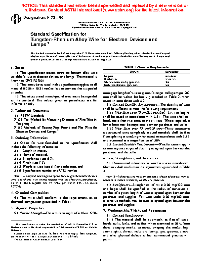 This specification covers tungsten-rhenium alloy wire suitable for use in electron devices and lamps. The material is known as UNS R07031. This wire shall conform to the requirements as to chemical composition prescribed. The wire shall be furnished in the following finishes: Finish 1; Finish 2; Finish 3; Finish 4; and Finish 5. The following test methods shall be performed to conform with the specified requirements: chemical analysis; tensile strength; ductility; visual inspection; and dimensional measurements.