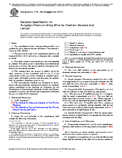 1.1 This specification covers tungsten-rhenium alloy wire suitable for use in electron devices and lamps.The material is known as UNS R07031.