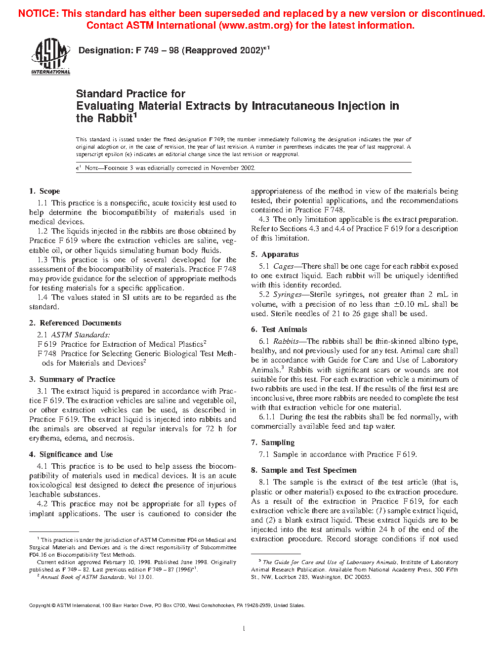 Standard Practice for Evaluating Material Extracts by Intracutaneous Injection in the Rabbit