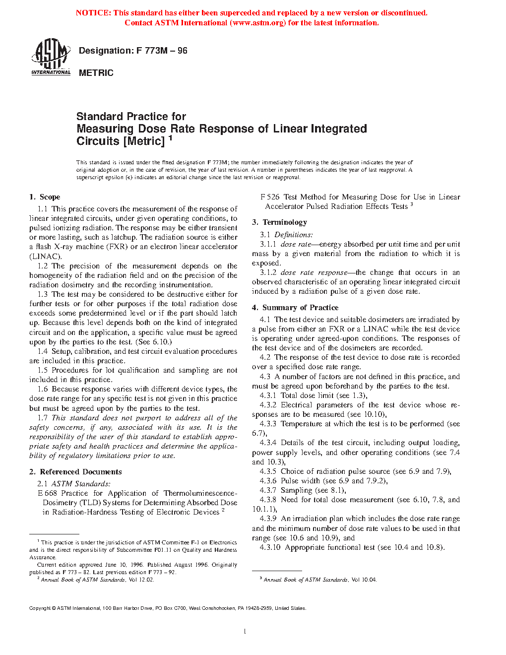 1.1 This practice covers the measurement of the response of linear integrated circuits, under given operating conditions, to pulsed ionizing radiation. The response may be either transient or more lasting, such as latchup. The radiation source is either a flash X-ray machine (FXR) or an electron linear accelerator (LINAC).
