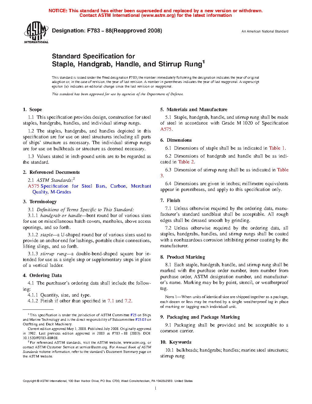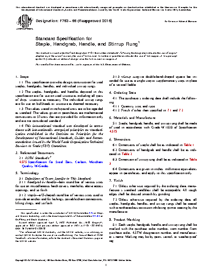 1.1 This specification provides design, construction for steel staples, handgrabs, handles, and individual stirrup rungs.