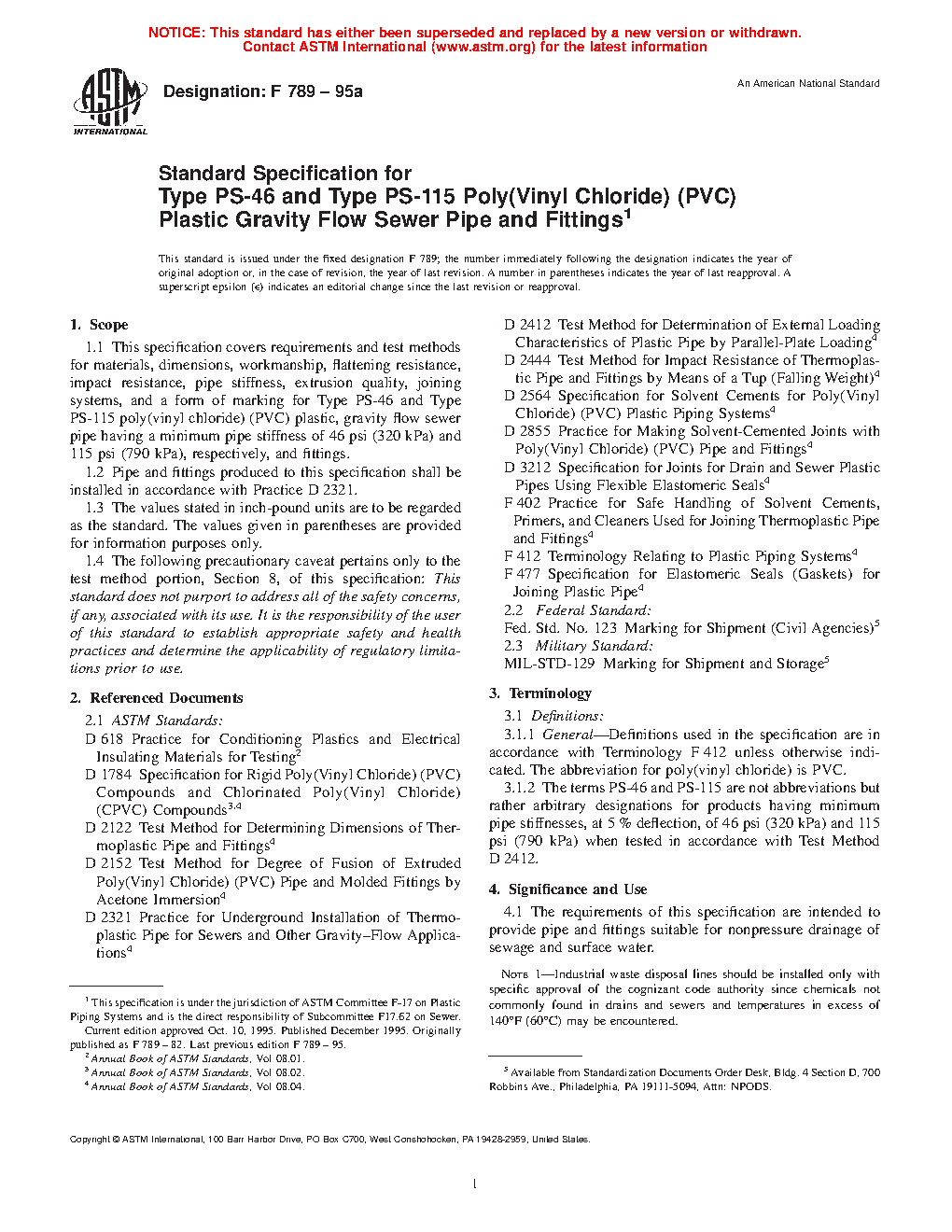 1.1 This specification covers requirements and test methods for materials, dimensions, workmanship, flattening resistance, impact resistance, pipe stiffness, extrusion quality, joining systems, and a form of marking for Type PS-46 and Type PS-115 poly(vinyl chloride) (PVC) plastic, gravity flow sewer pipe having a minimum pipe stiffness of 46 psi (320 kPa) and 115 psi (790 kPa), respectively, and fittings.