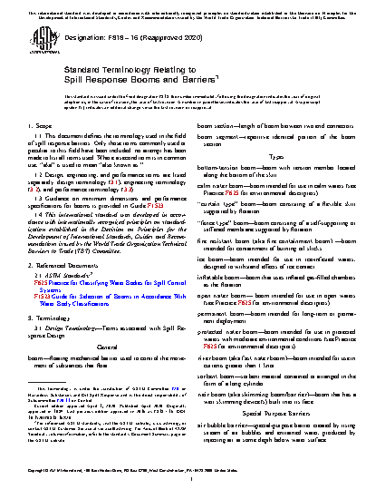 1.1 This document defines the terminology used in the field of spill response barriers. Only those terms commonly used or peculiar to this field have been included; no attempt has been made to list all terms used. Where a second term is in common use, “aka” is used to mean “also known as.”