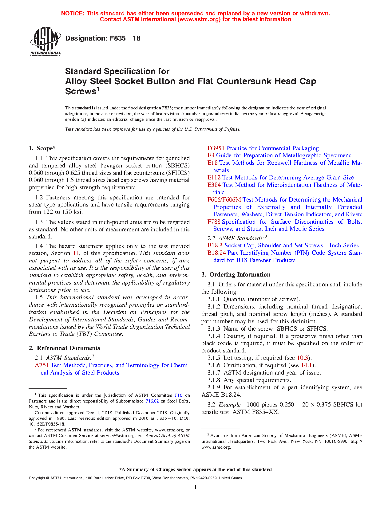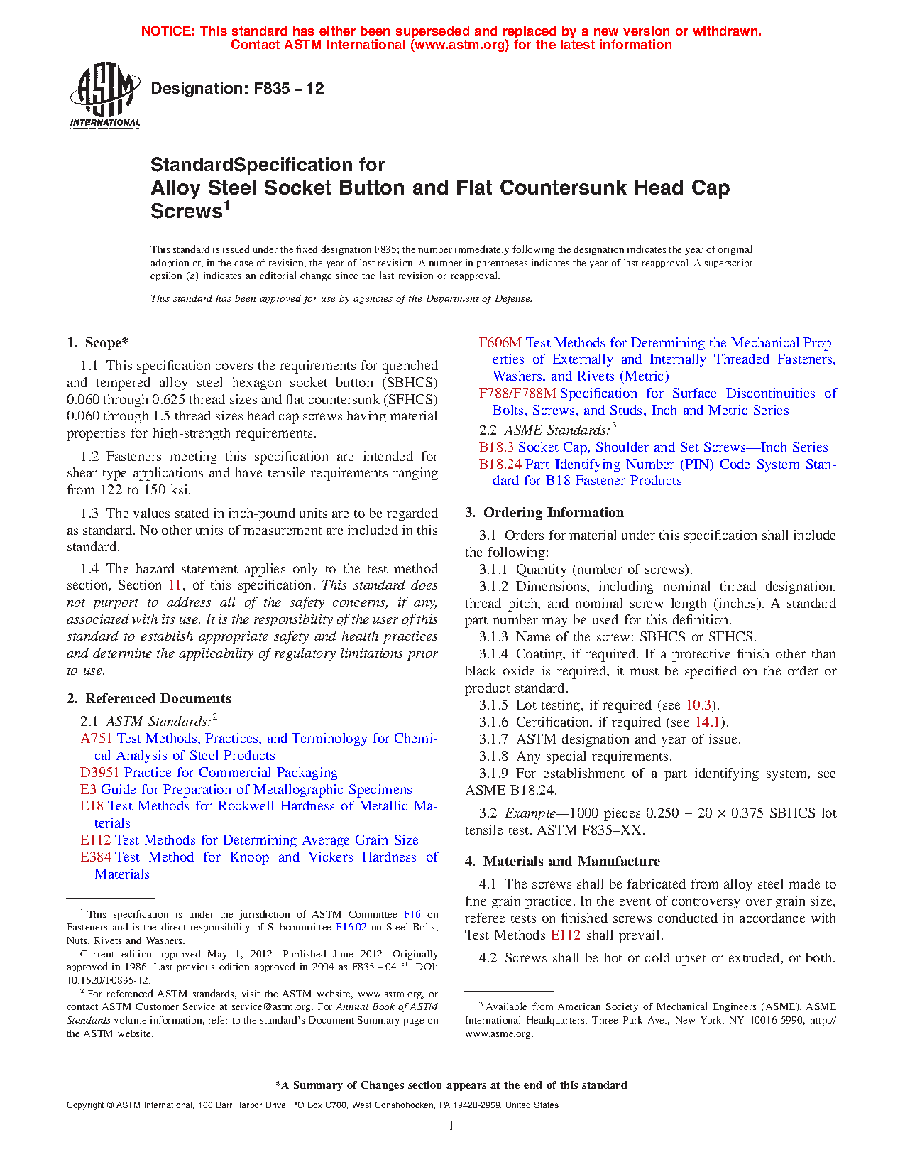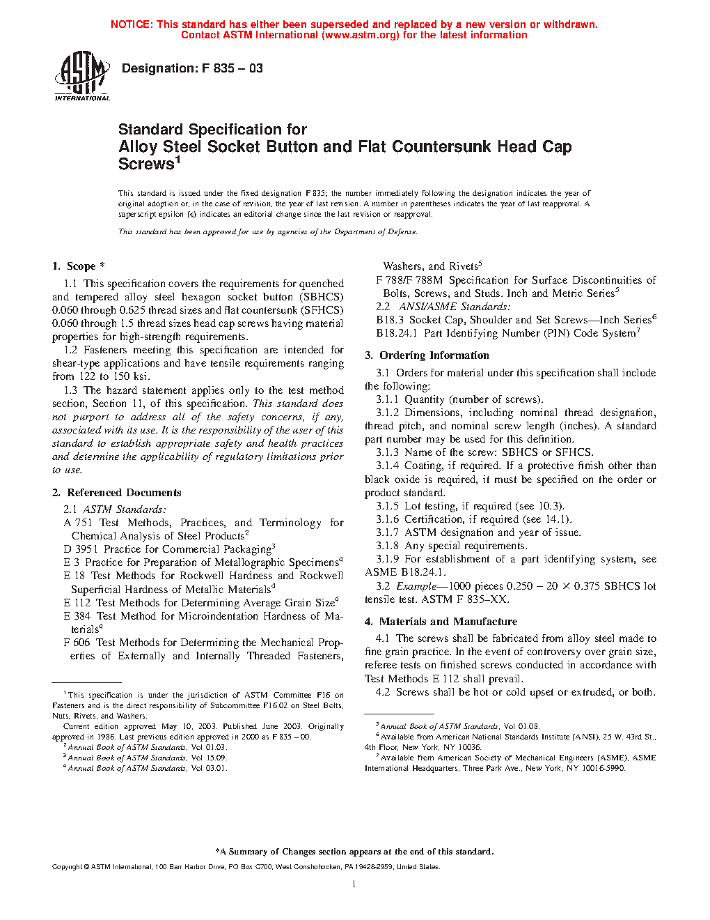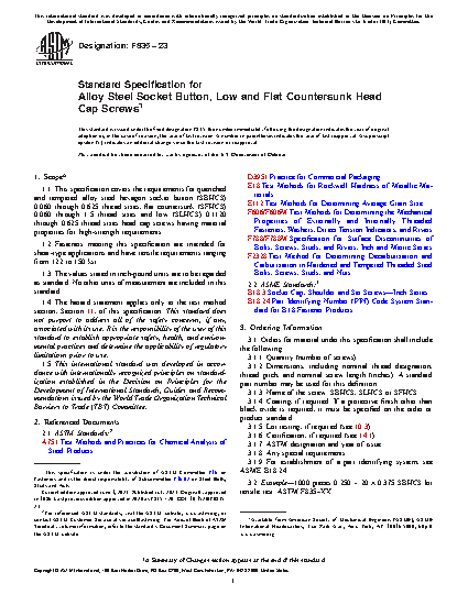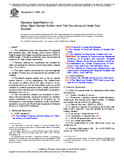 1.1 This specification covers the requirements for quenched and tempered alloy steel hexagon socket button (SBHCS) 0.060 through 0.625 thread sizes and flat countersunk (SFHCS) 0.060 through 1.5 thread sizes head cap screws having material properties for high-strength requirements.