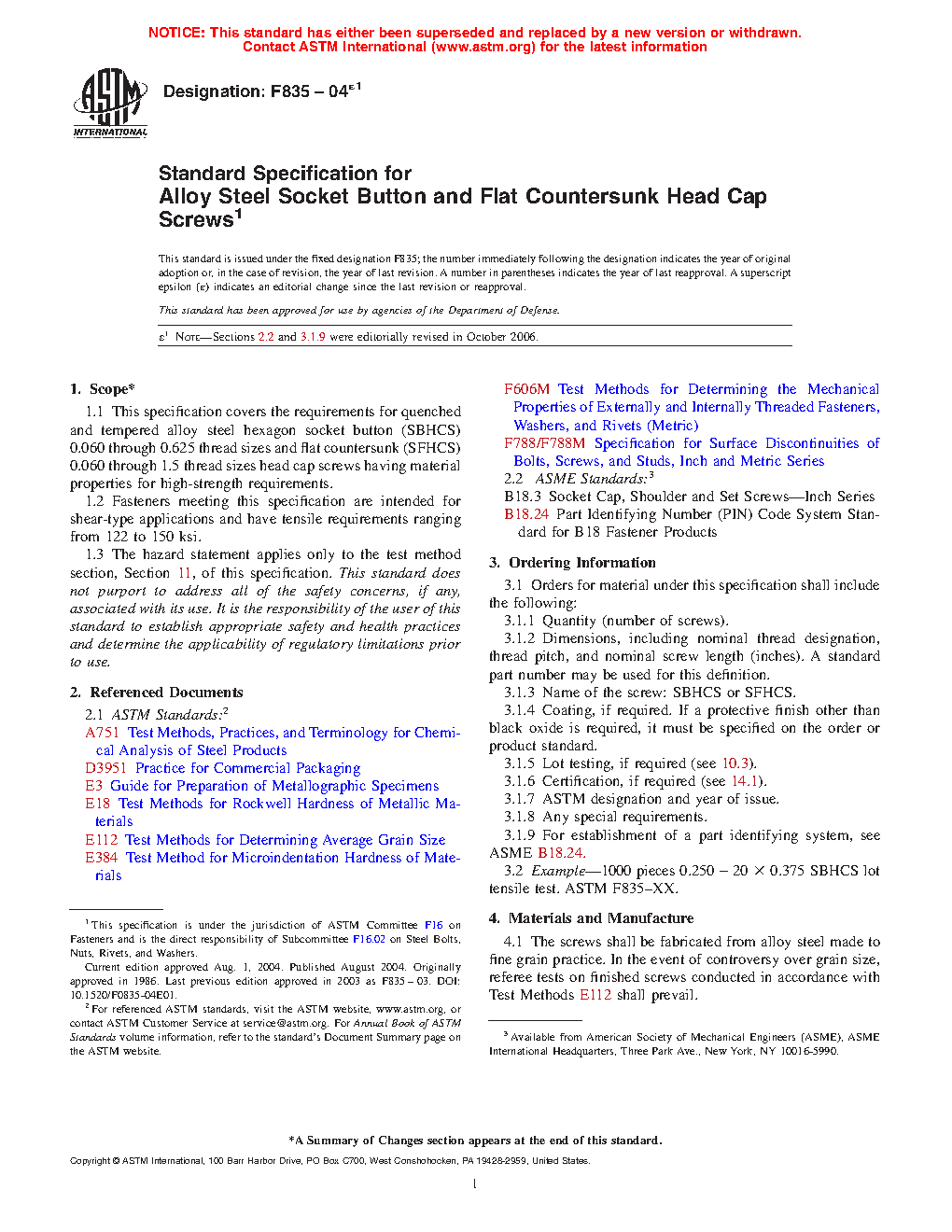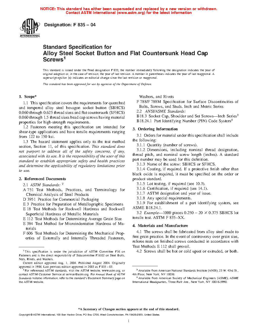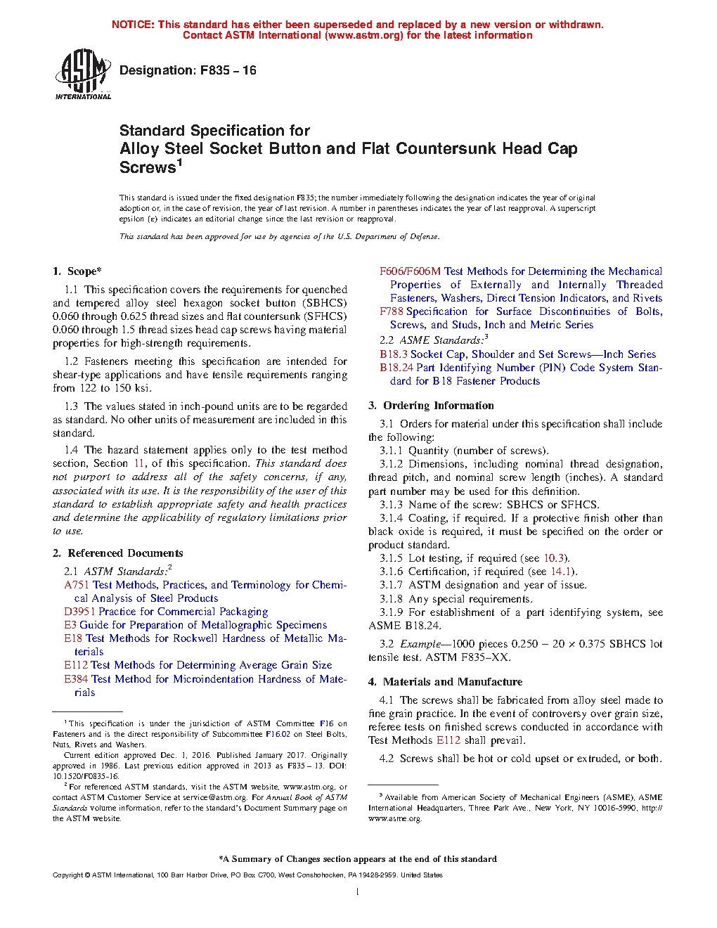 1.1 This specification covers the requirements for quenched and tempered alloy steel hexagon socket button (SBHCS) 0.060 through 0.625 thread sizes and flat countersunk (SFHCS) 0.060 through 1.5 thread sizes head cap screws having material properties for high-strength requirements.
