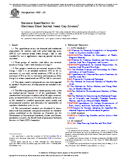 1.1 This specification covers the chemical and mechanical requirements for stainless steel inch socket head cap screw (SHCS) with nominal thread 0.060 through 1.500 in. and intended for use in applications requiring general corrosion resistance.