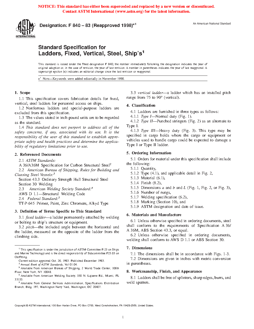 1.1 This specification covers fabrication details for fixed, vertical, steel ladders for personnel access on ships.
