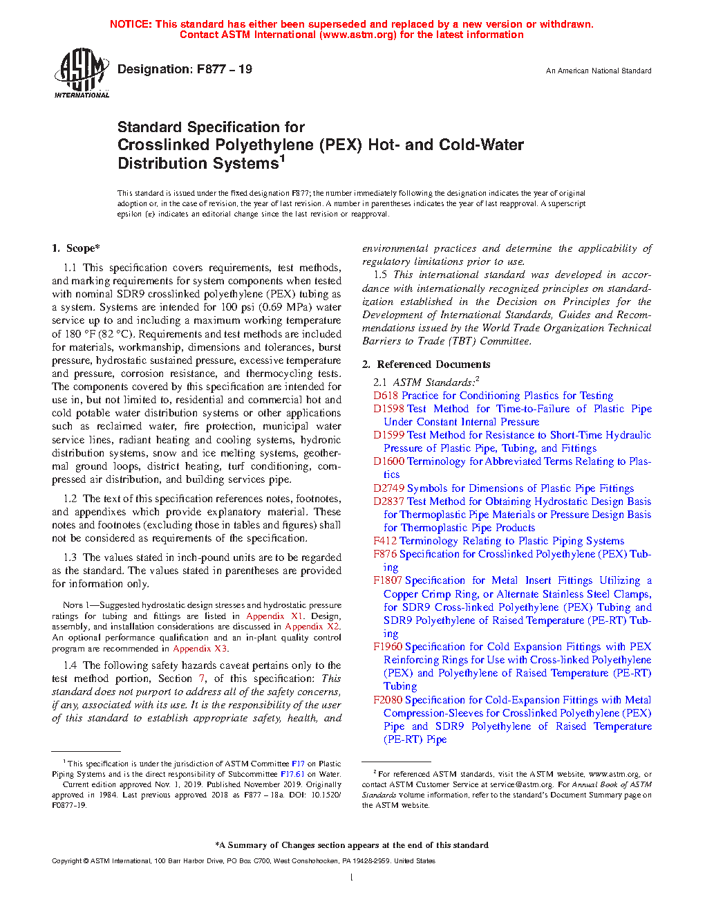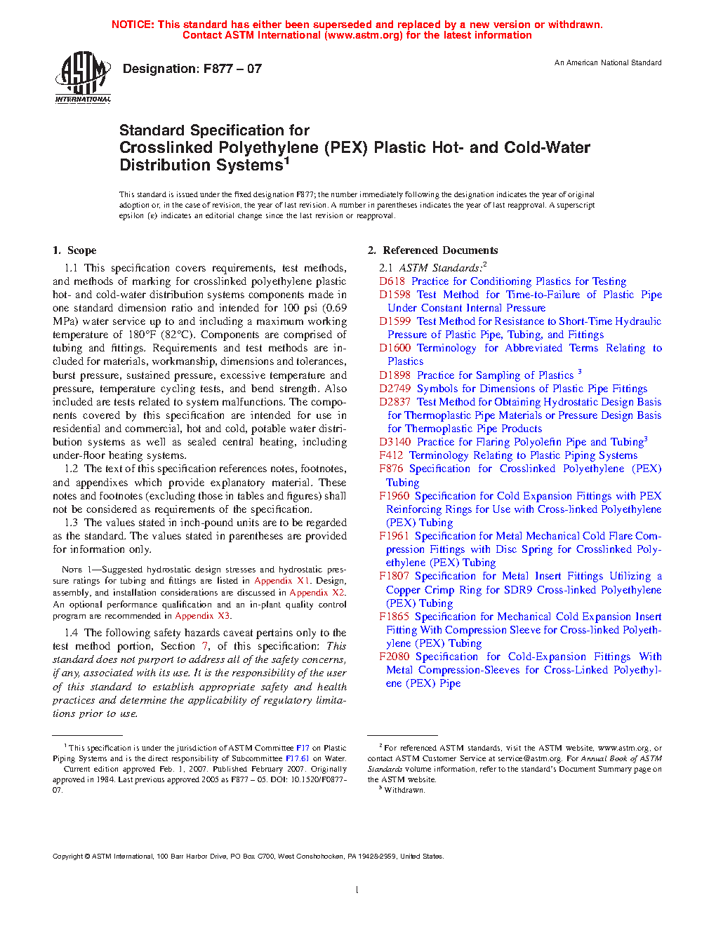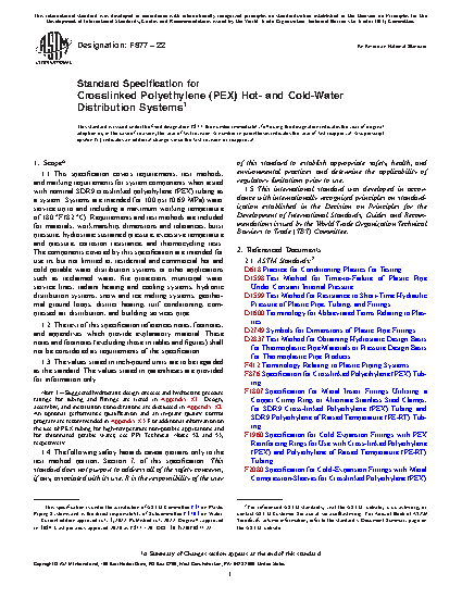 This specification covers requirements, test methods, and methods of marking for crosslinked polyethylene plastic hot- and cold-water distribution systems components made in one standard dimension ratio. Components are comprised of tubing and fittings intended for use in residential and commercial, hot and cold, potable water distribution systems as well as sealed central heating, including under-floor heating systems. Requirements and test methods are included for materials, workmanship, dimensions and tolerances, burst pressure, sustained pressure, excessive temperature and pressure, temperature cycling tests, and bend strength. Also included are tests related to system malfunctions.