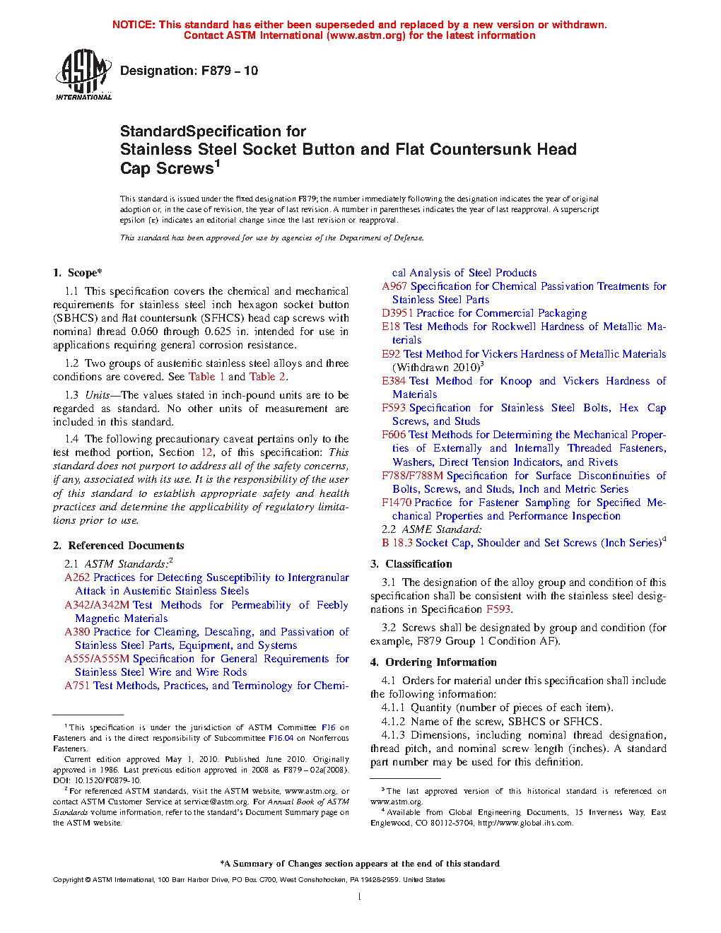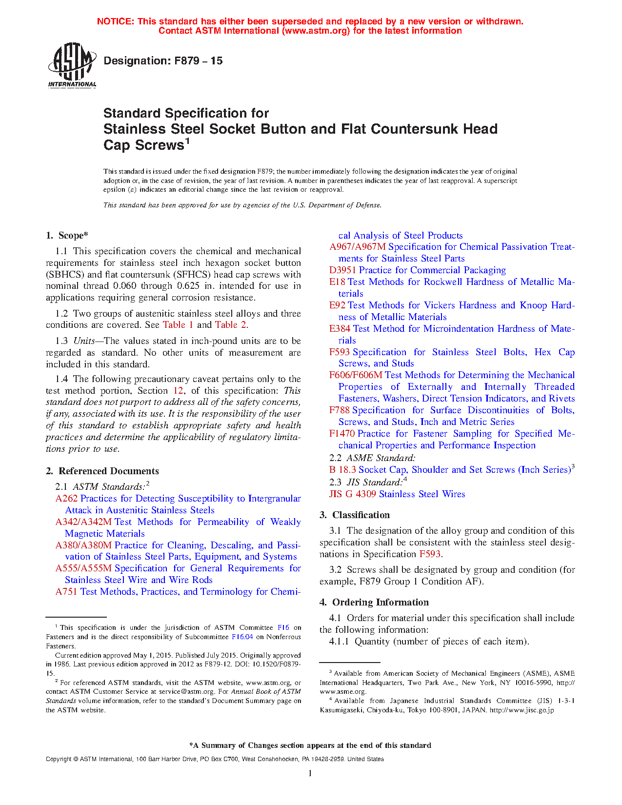 1.1 This specification covers the chemical and mechanical requirements for stainless steel inch hexagon socket button (SBHCS) and flat countersunk (SFHCS) head cap screws with nominal thread 0.060 through 0.625 in. intended for use in applications requiring general corrosion resistance.