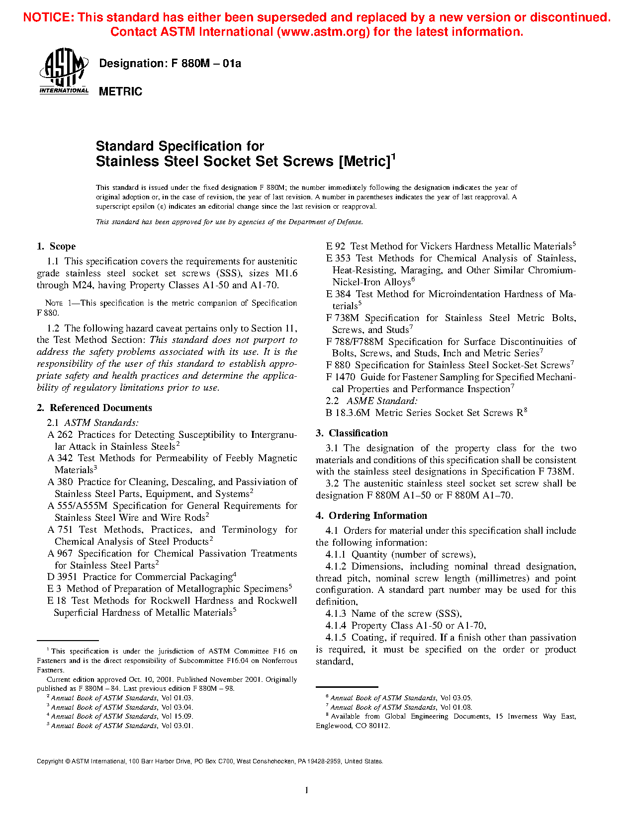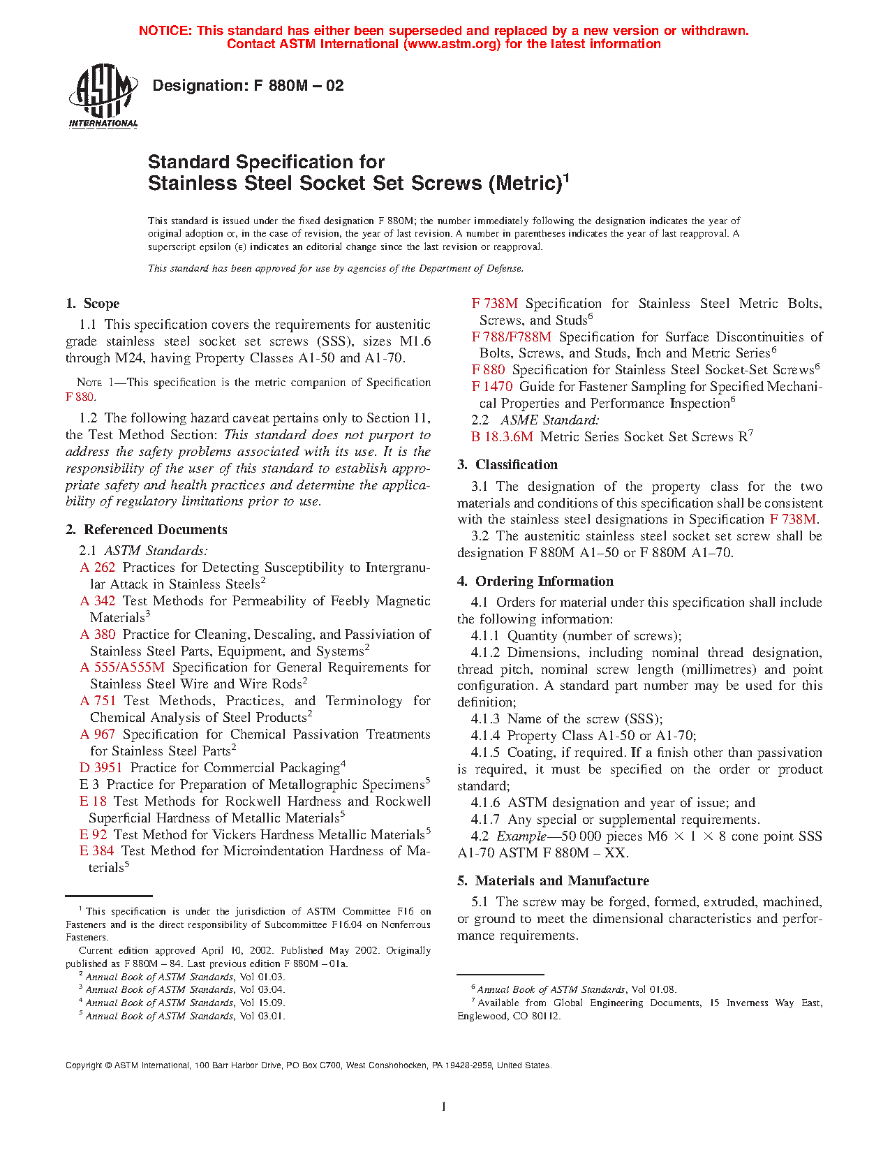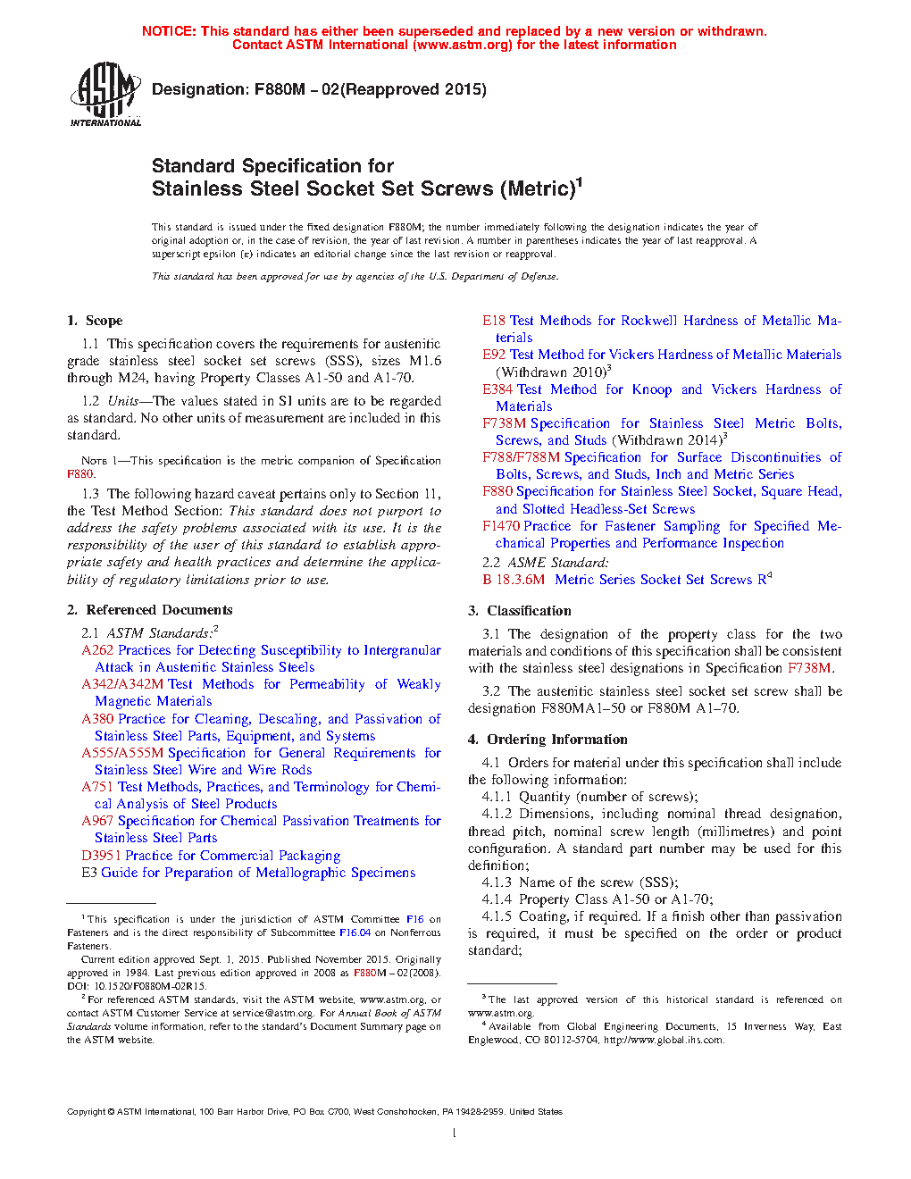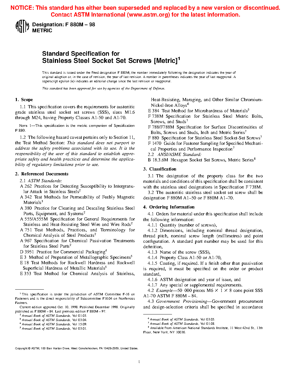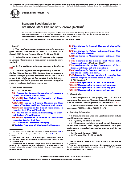 1.1 This specification covers the requirements for austenitic grade stainless steel socket set screws (SSS), sizes M1.6 through M24, having Property Classes A1-50 and A1-70.