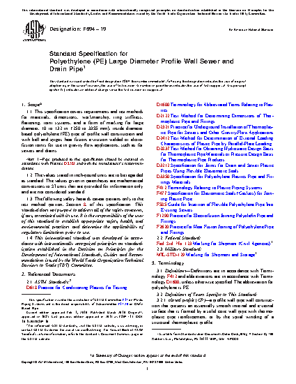 This specification covers requirements and test methods for materials, dimensions, workmanship, ring stiffness, flattening, joint systems, and a form of marking for polyethylene (PE) pipe of profile wall construction and with bell and spigot, heat fusion, extrusion welded or electrofusion joints for use in gravity flow applications, such as for sewers and drains. The PE profile wall pipe products cover six standard ring stiffness constant (RSC) classifications, namely 40, 63, 100, and 160, 250 and 400. These are referred to as RSC 40, RSC 63, RSC 100, RSC 160, RSC 250 and RSC 400. Referee testing, ring stiffness constant testing, flattening test, and joint tightness test shall be performed to meet the requirements prescribed.