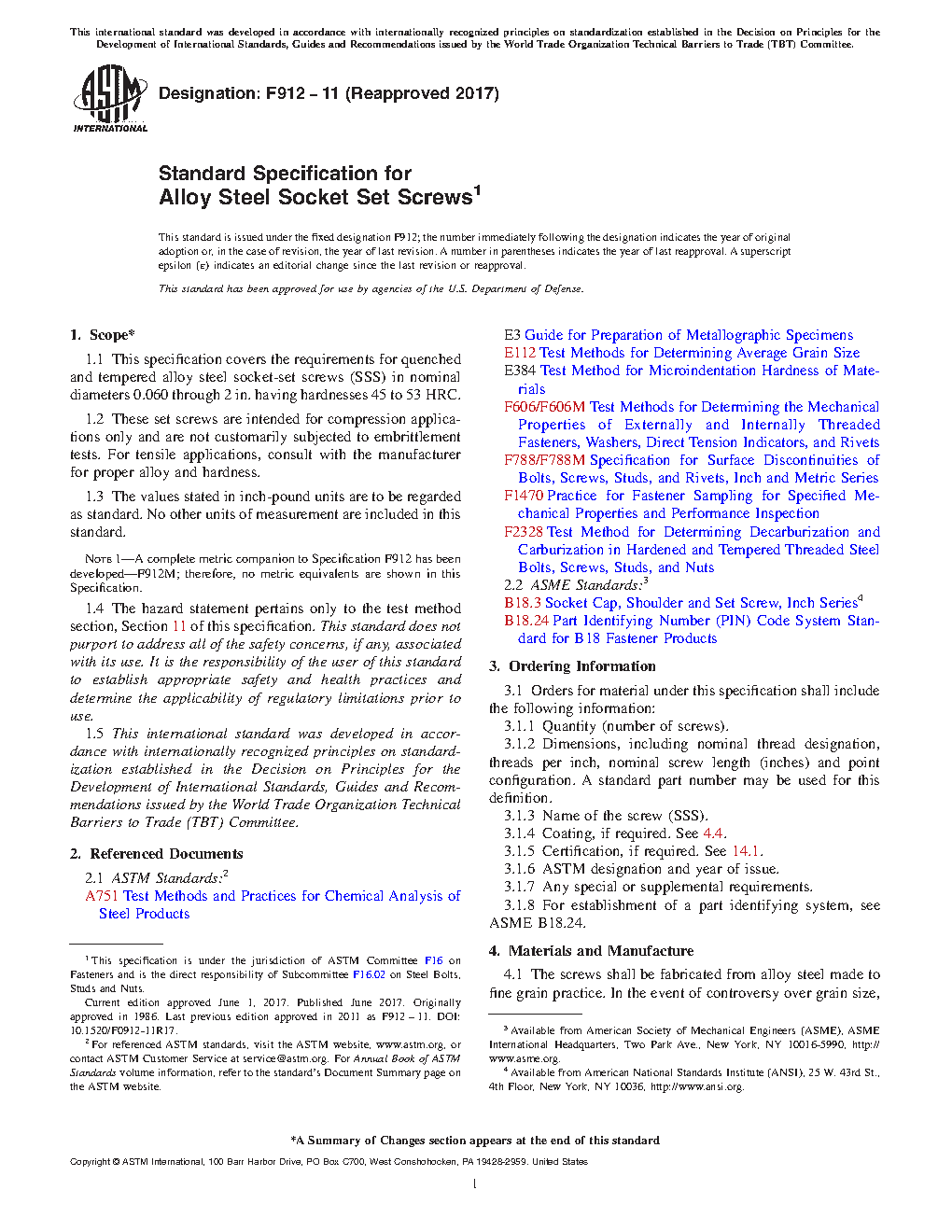 1.1 This specification covers the requirements for quenched and tempered alloy steel socket-set screws (SSS) 0.060 through 2.000-in. sizes having hardnesses 45 to 53 HRC.