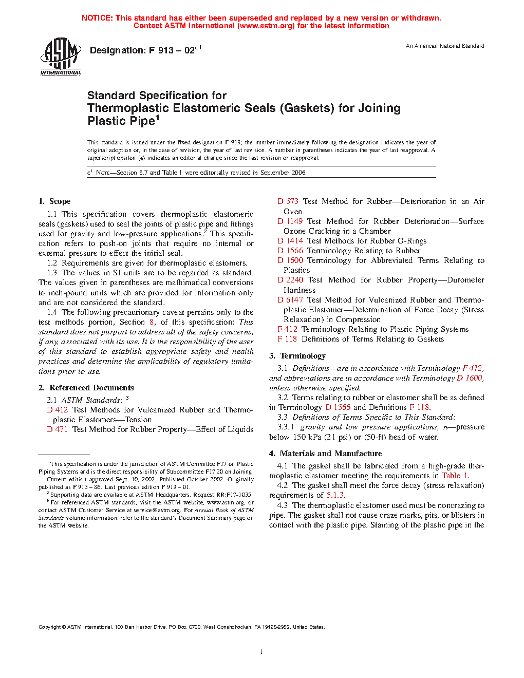 1.1 This specification covers thermoplastic elastomeric seals (gaskets) used to seal the joints of plastic pipe and fittings used for gravity and low-pressure applications.2 This specification refers to push-on joints that require no internal or external pressure to effect the initial seal.