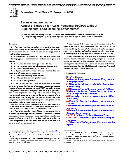 1.1 This test method describes a procedure for non-destructive testing using acoustic emission (AE) testing for aerial personnel devices, which do not have a supplemental load handling attachment.