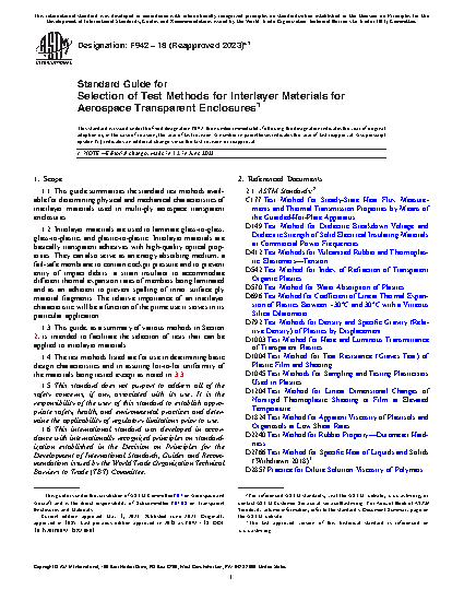 1.1 This guide summarizes the standard test methods available for determining physical and mechanical characteristics of interlayer materials used in multi-ply aerospace transparent enclosures.