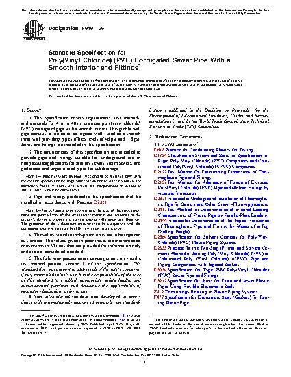 1.1 This specification covers requirements, test methods, and materials for 4 to 48 in. diameter poly(vinyl chloride) (PVC) corrugated pipe with a smooth interior. This profile wall pipe consists of an outer corrugated wall fused to a smooth inner wall providing pipe stiffness levels of 46 psi and 115psi. Joints and fittings are included in this specification.
