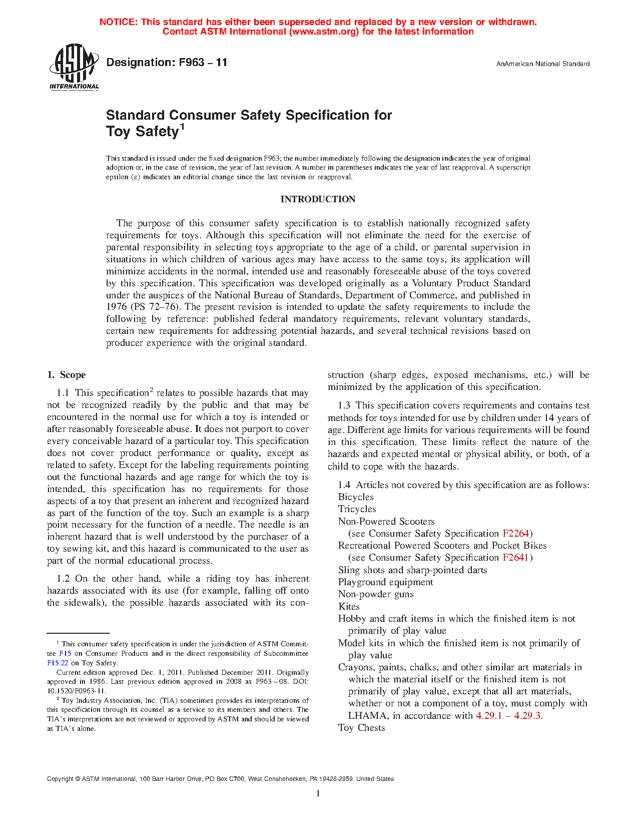 1.1 This specification2 relates to possible hazards that may not be recognized readily by the public and that may be encountered in the normal use for which a toy is intended or after reasonably foreseeable abuse. It does not purport to cover every conceivable hazard of a particular toy. This specification does not cover product performance or quality, except as related to safety. Except for the labeling requirements pointing out the functional hazards and age range for which the toy is intended, this specification has no requirements for those aspects of a toy that present an inherent and recognized hazard as part of the function of the toy. Such an example is a sharp point necessary for the function of a needle. The needle is an inherent hazard that is well understood by the purchaser of a toy sewing kit, and this hazard is communicated to the user as part of the normal educational process.
