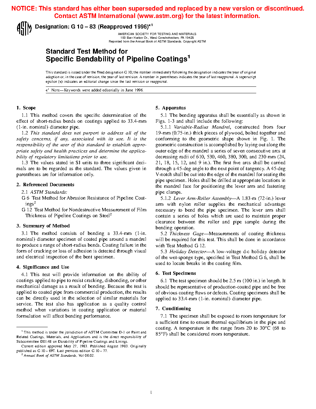 1.1 This test method covers the specific determination of the effect of short-radius bends on coatings applied to 33.4 mm (1 in. nominal) diameter pipe.